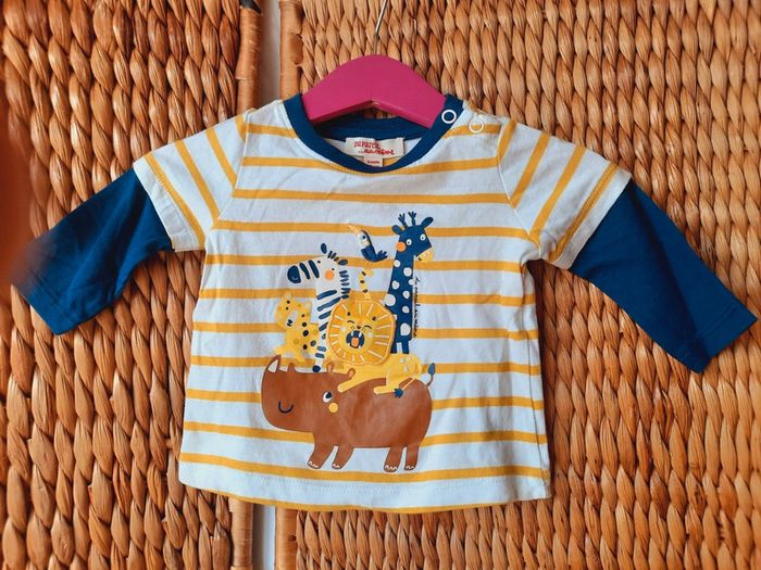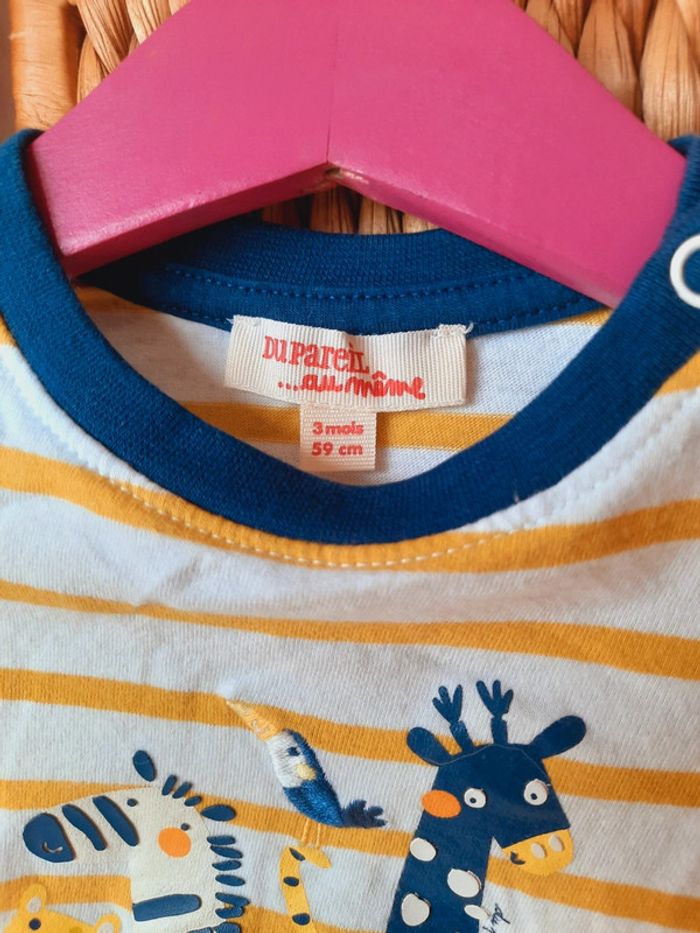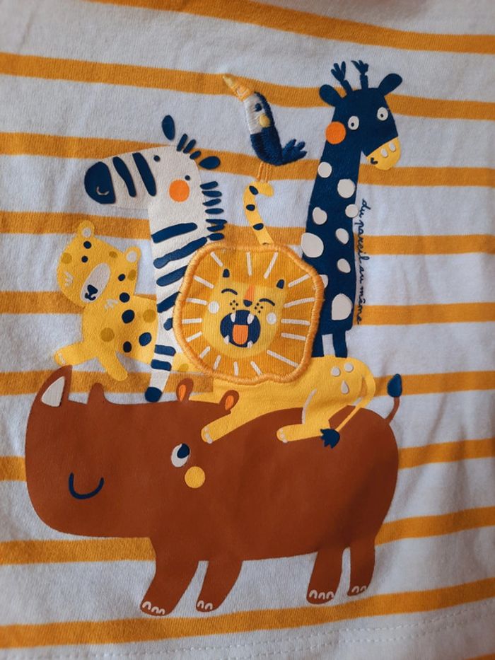 Petit haut bébé Du pareil au même, rayé jaune imprimé hippopotame, lion, zèbre, girafe, léopard, oiseau..., taille 3 mois, très bon état
