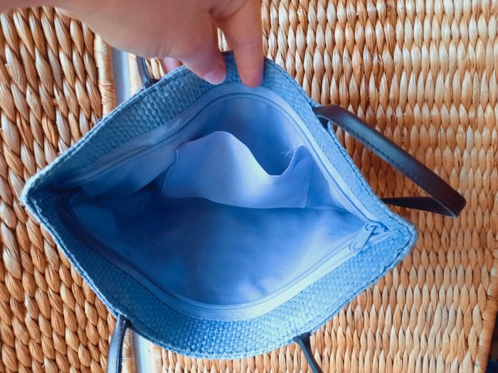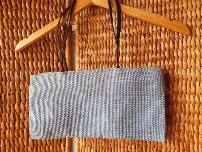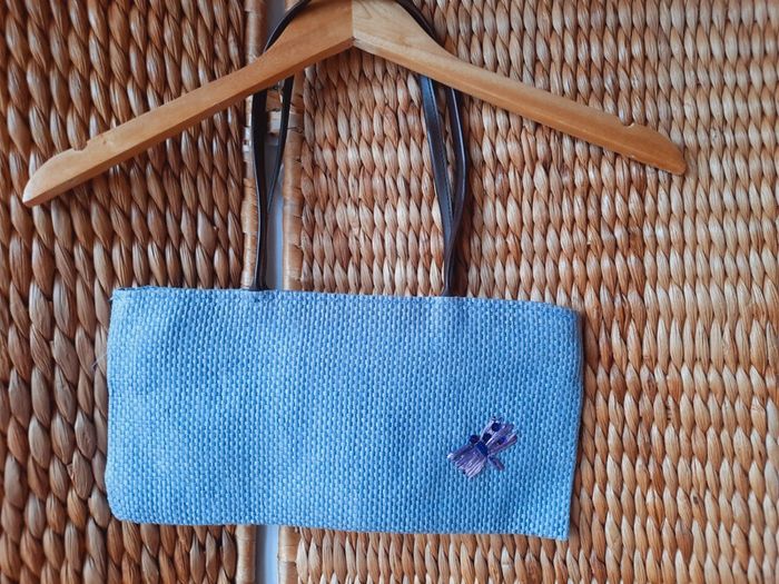 Sac à main d'été, tressé, couleur lilas, petit papillon en rafia, anses en cuir, 34 x 17 cm, très bon état