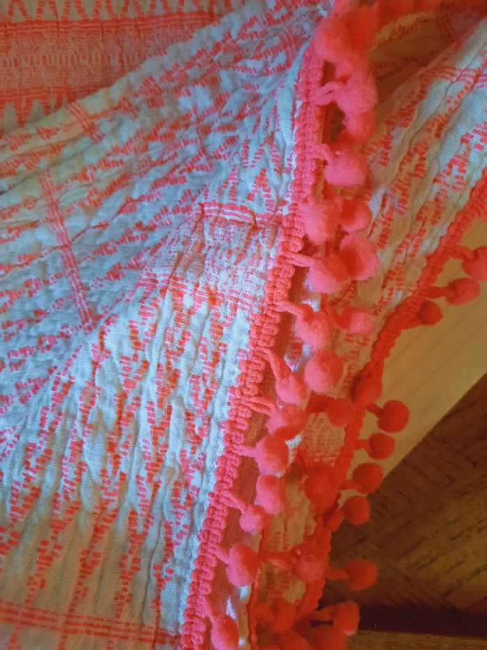 Poncho Etam rose, motifs ethniques, petits pompons, taille unique (M/XL), comme neuf