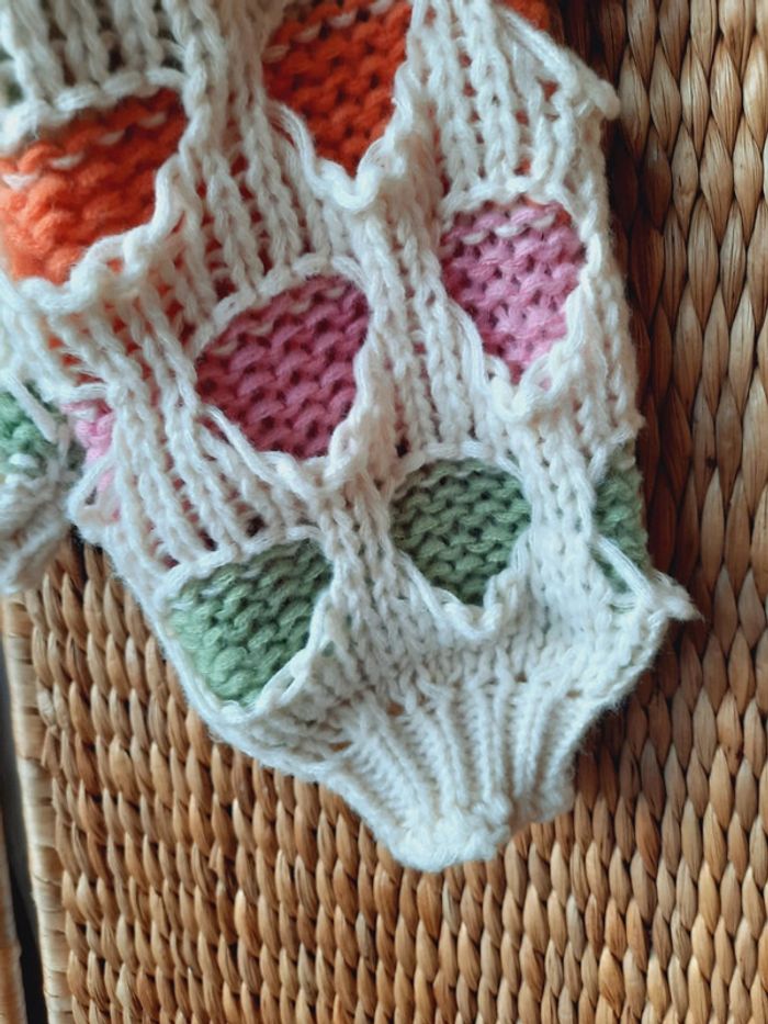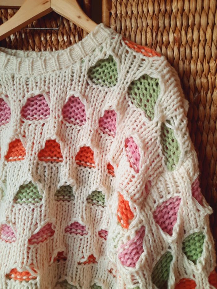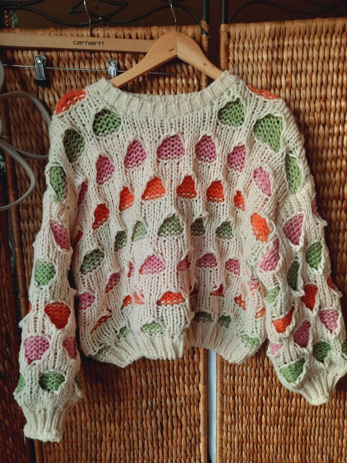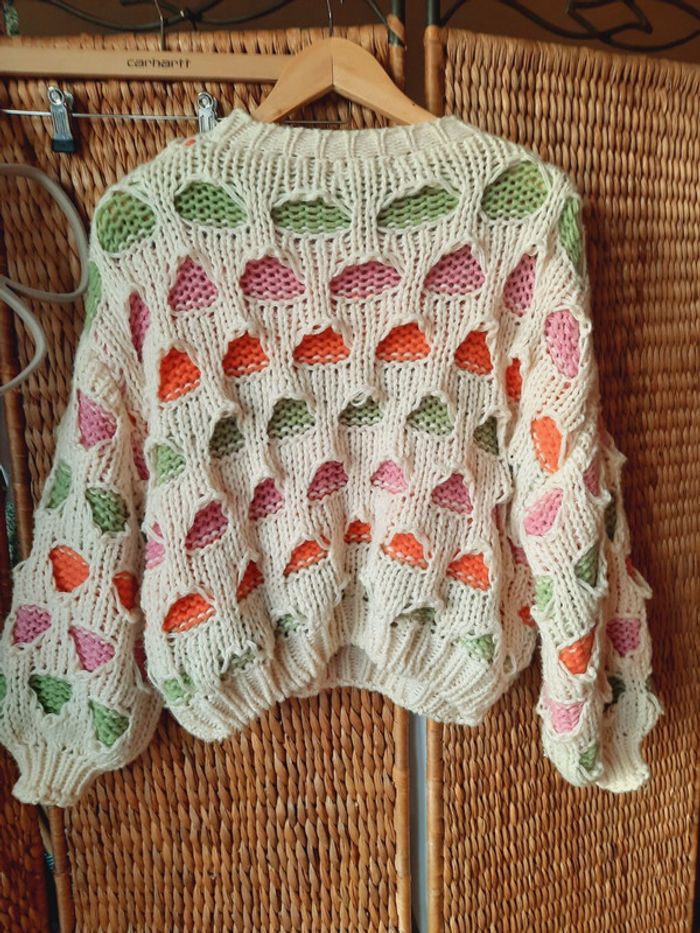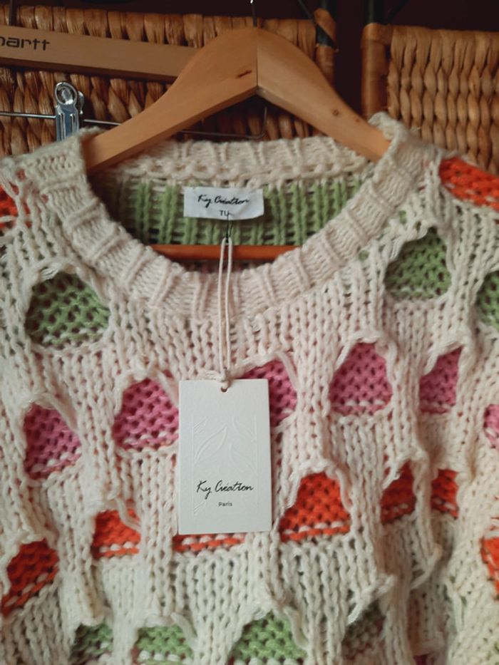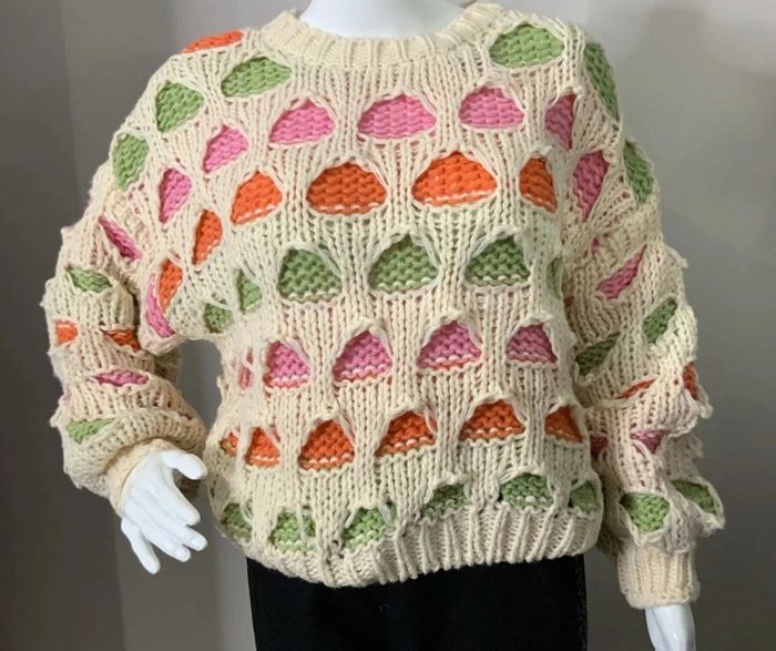 Pull écru en grosses mailles, trous ajourés, doublure colorée pastel, manches bouffantes, taille unique, M-L-XL, neuf avec étiquette