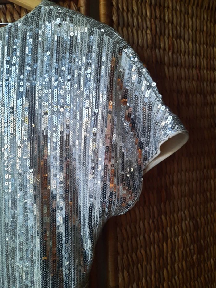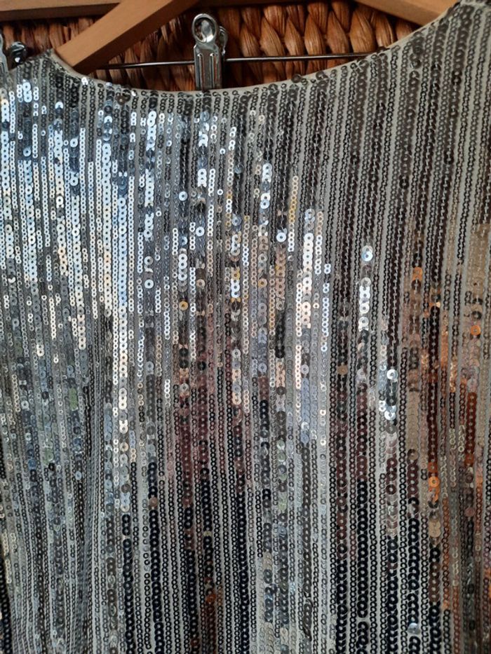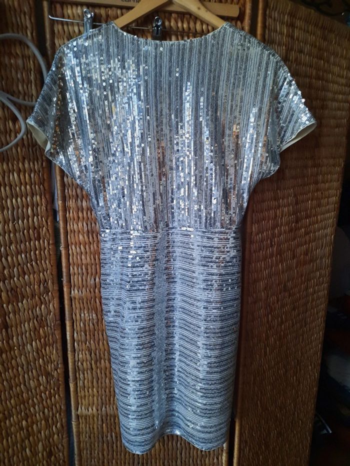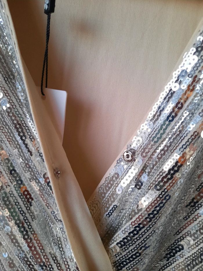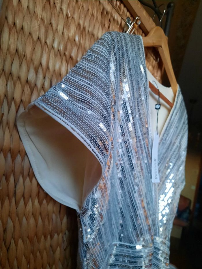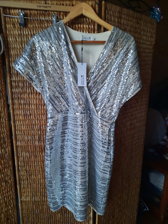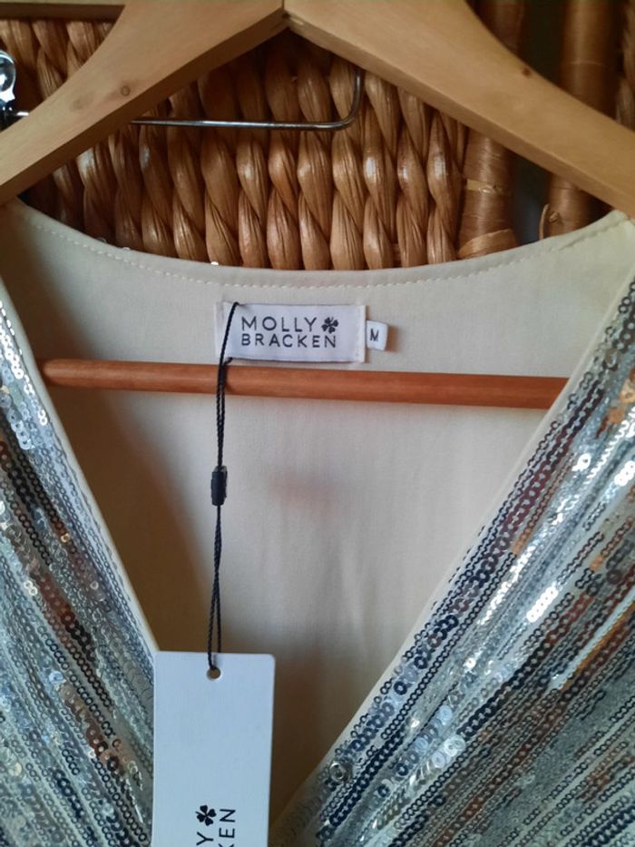 Robe de soirée, fêtes, cocktails, Molly Bracken en sequins, décolleté croisé, fermeture éclair sur le côté sous le bras gauche, doublée, taille M, neuve avec étiquette