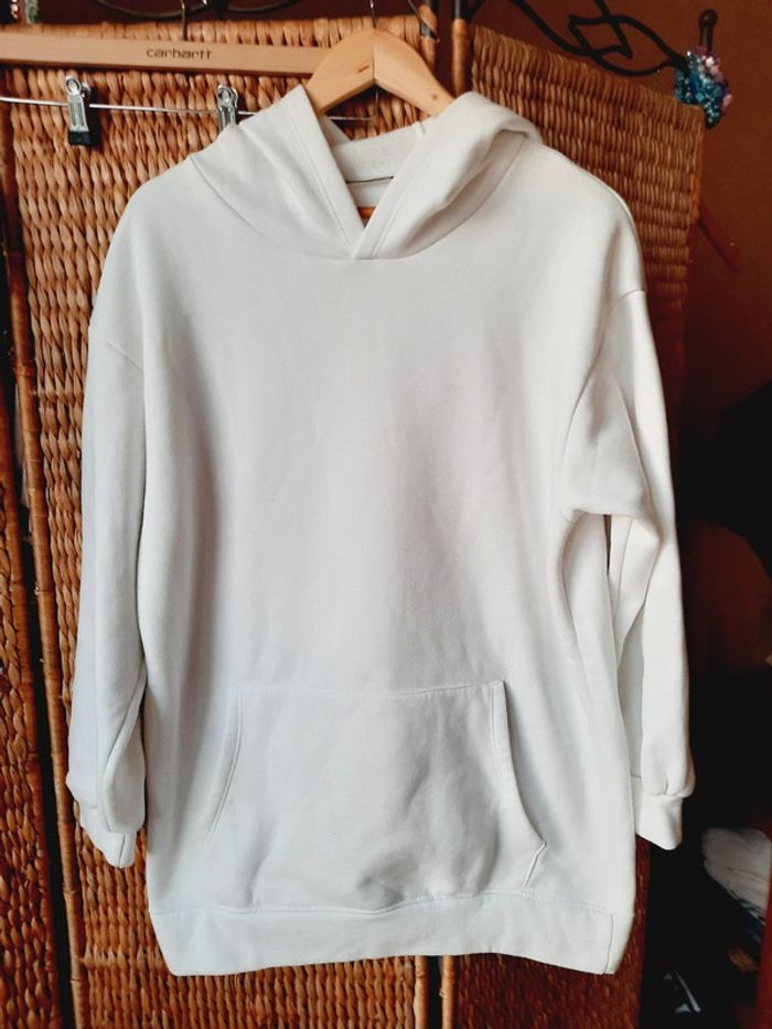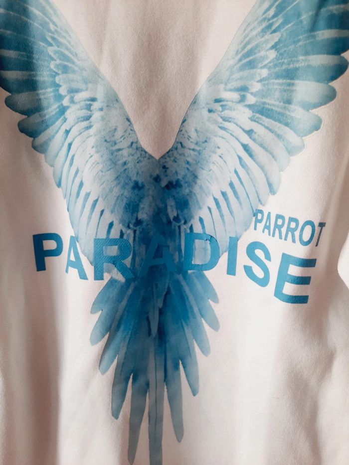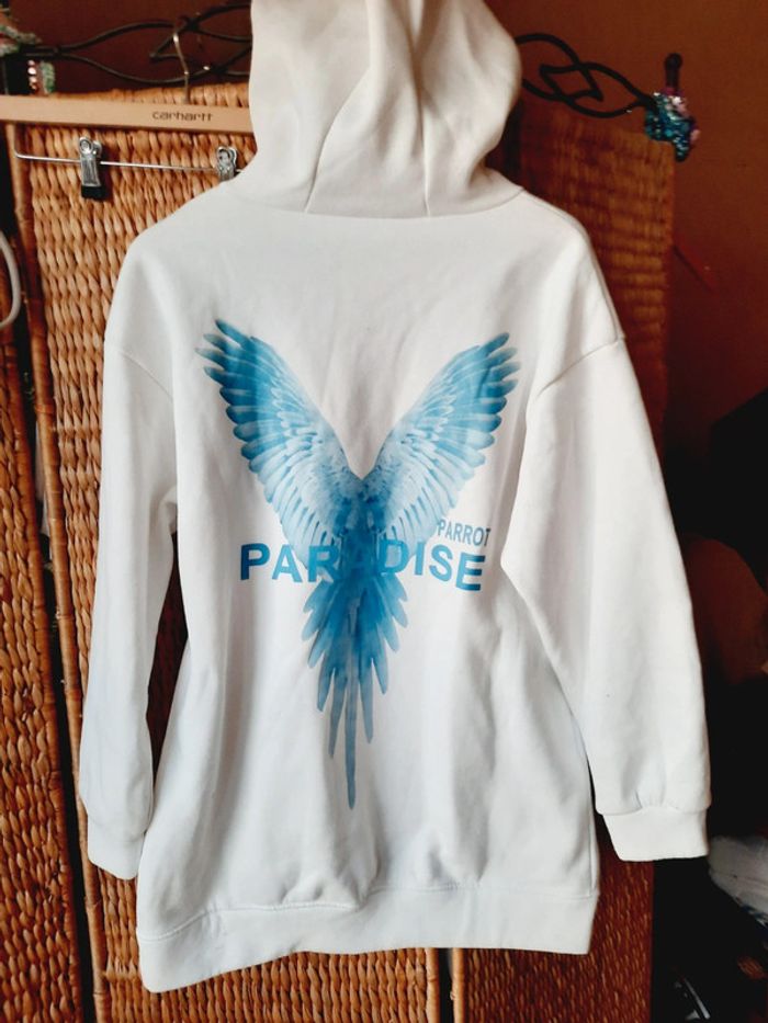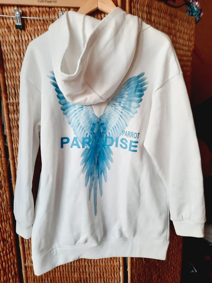 Sweat long, à capuche, blanc, imprimé dans le dos, Parrot paradise, le mot paradise est un peu usé, taille L