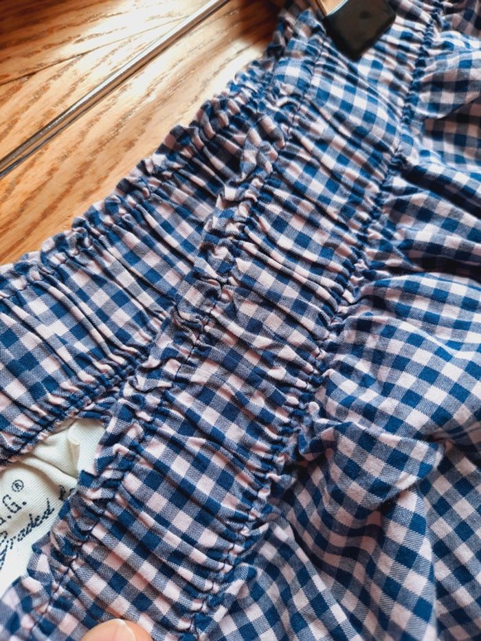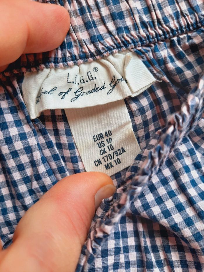 Blouse L.O.G.G H&M, carreaux vichy bleu et rose pâle, col bardot, taille 40, manches 3/4, laçage au bout des manches, très bon état