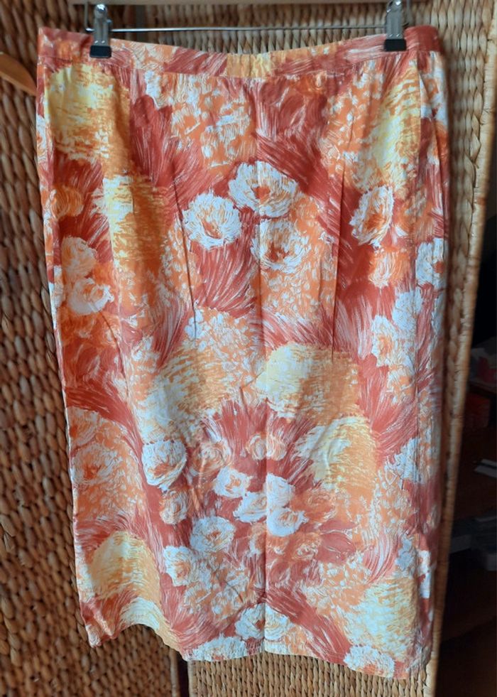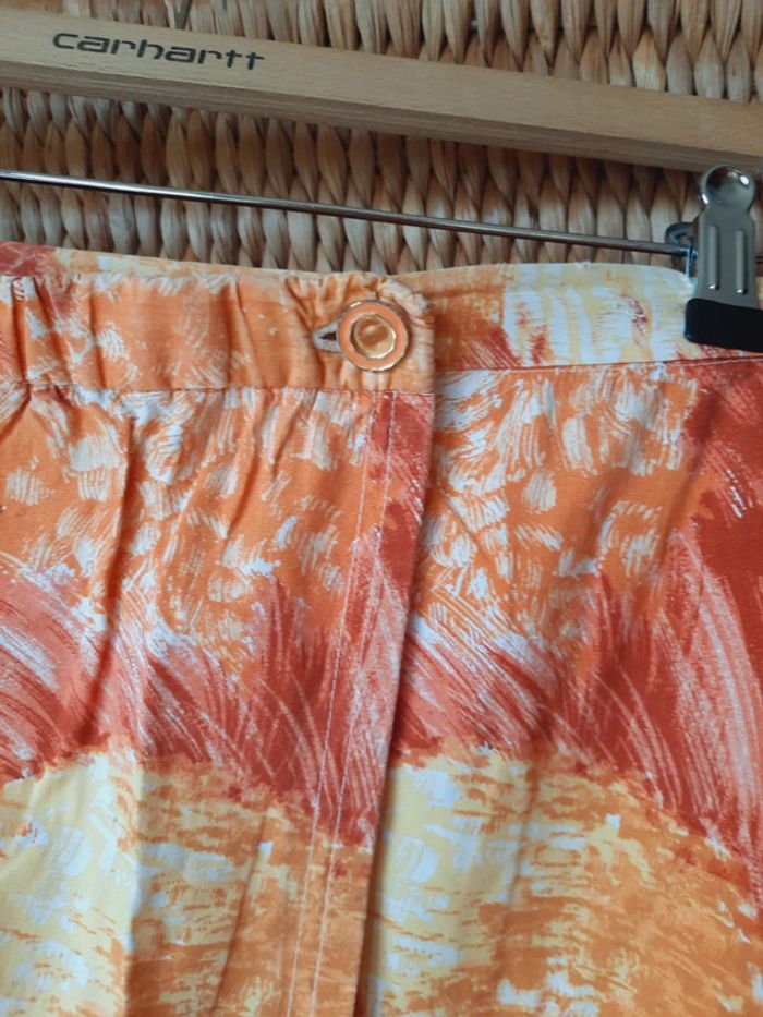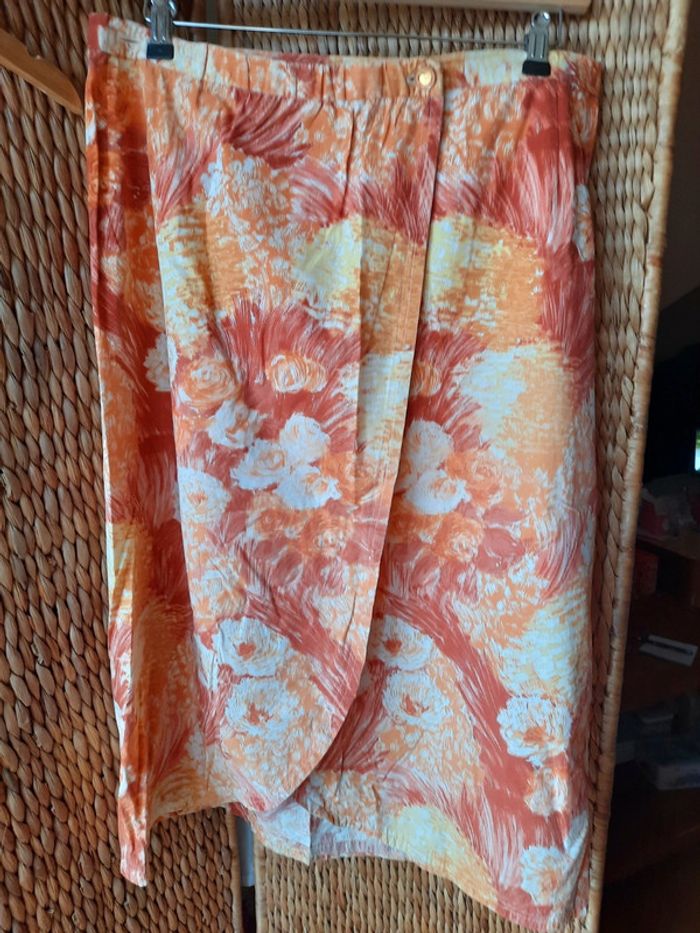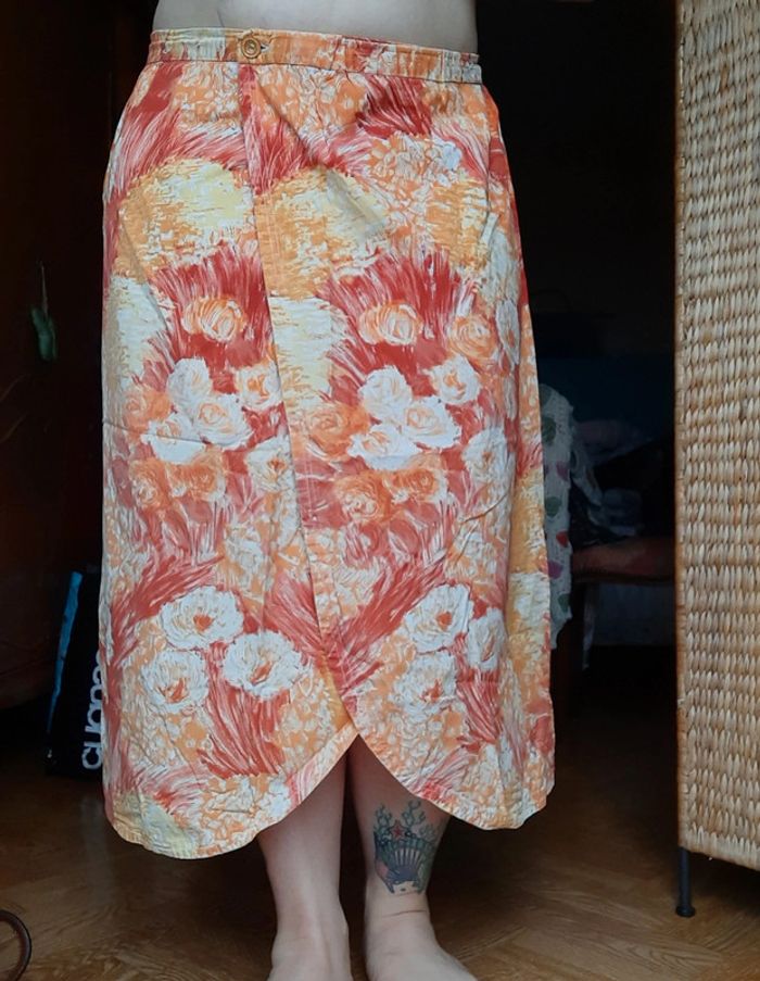 Jupe couturière ancienne, vintage, pièce unique, nuances de orange, jupe Croisée, largeur taille 45 cm, longueur jupe 77,5 cm, taille 42, très bon état