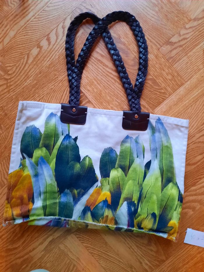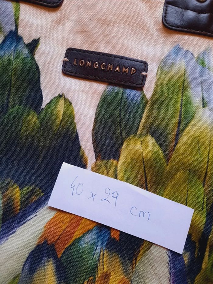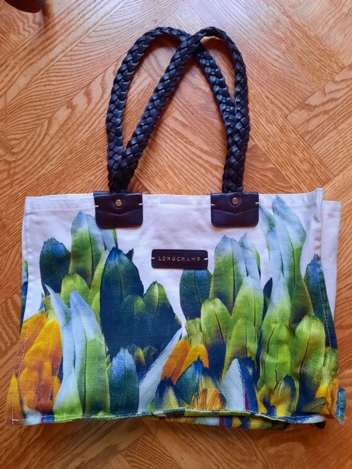 Magnifique sac à main Longchamp, lanières cuir, modèle plumes de perroquet, très bon état