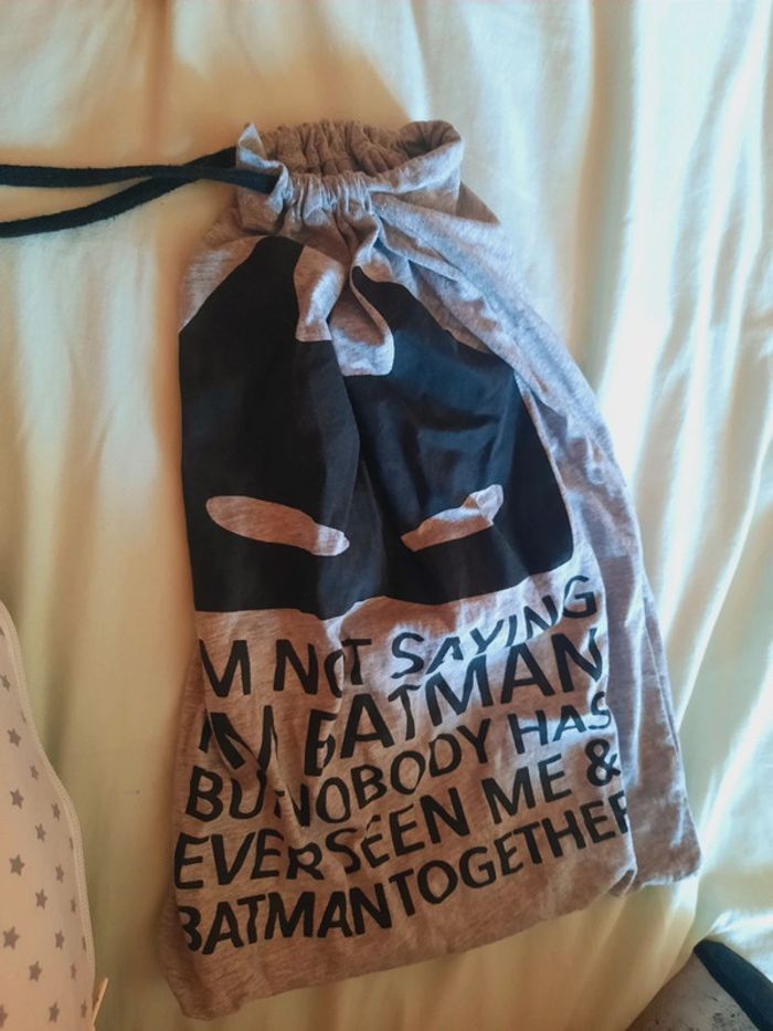 Tote bag Undiz gris, motif batman, très bon état, avec laçage, idéal sac pour le linge, ou protéger un vêtement dans la machine à laver
