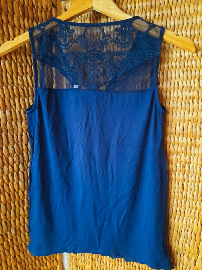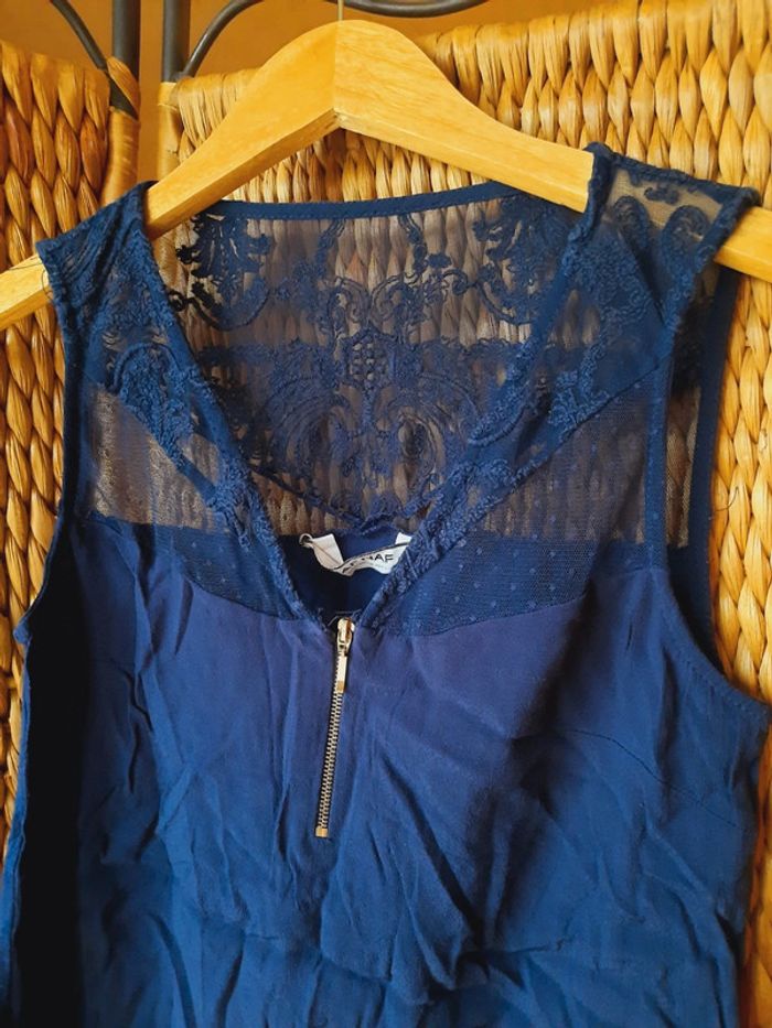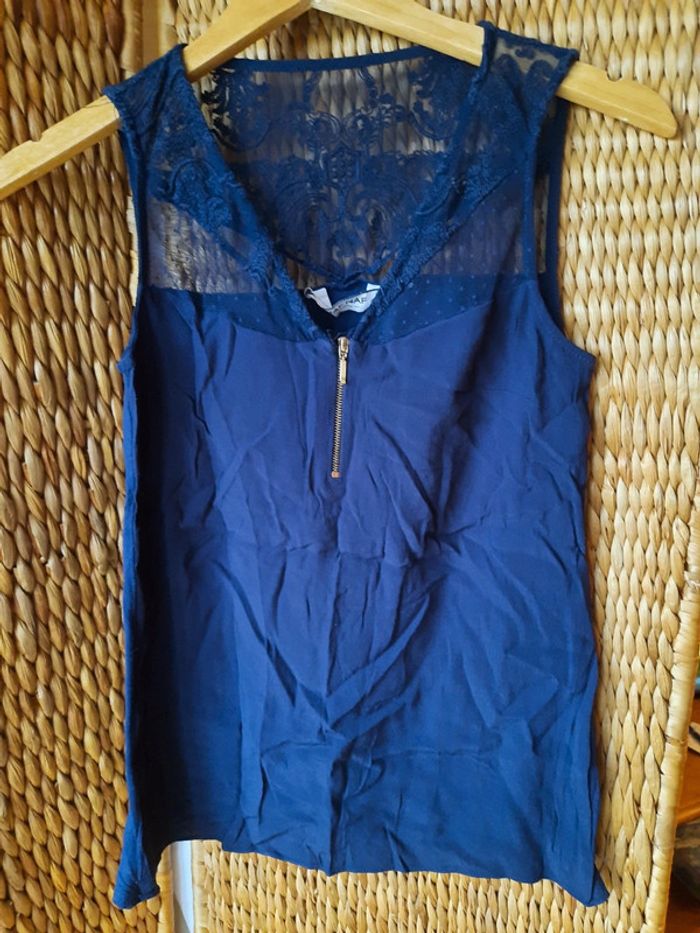 Blouse Naf-Naf sans manches, bleu marine, dentelle, fermeture éclair au décolleté, taille S,très bon état