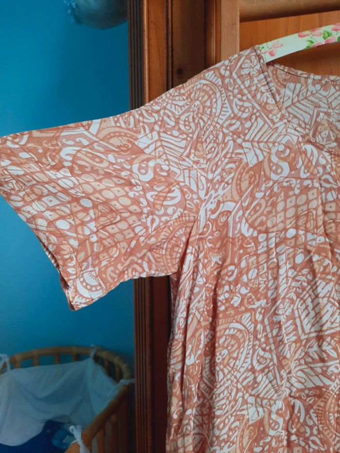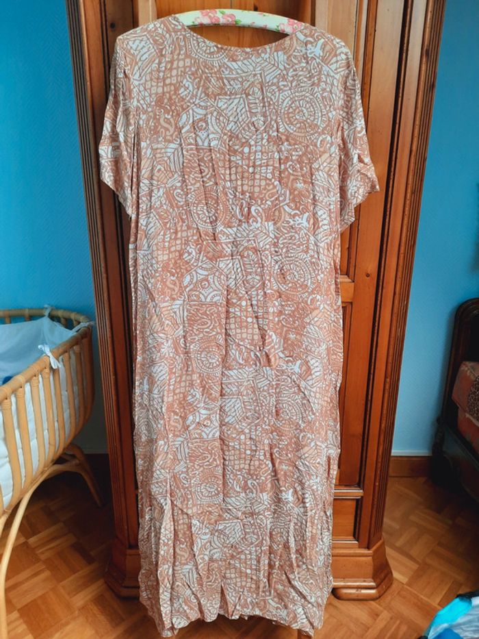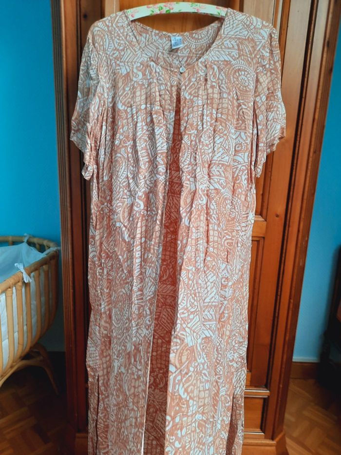 Longue tunique robe, motifs, petit bouton nacre dans le cou, ouverte sur l'ensemble de la longueur, 100% viscose, taille 46, très bon état