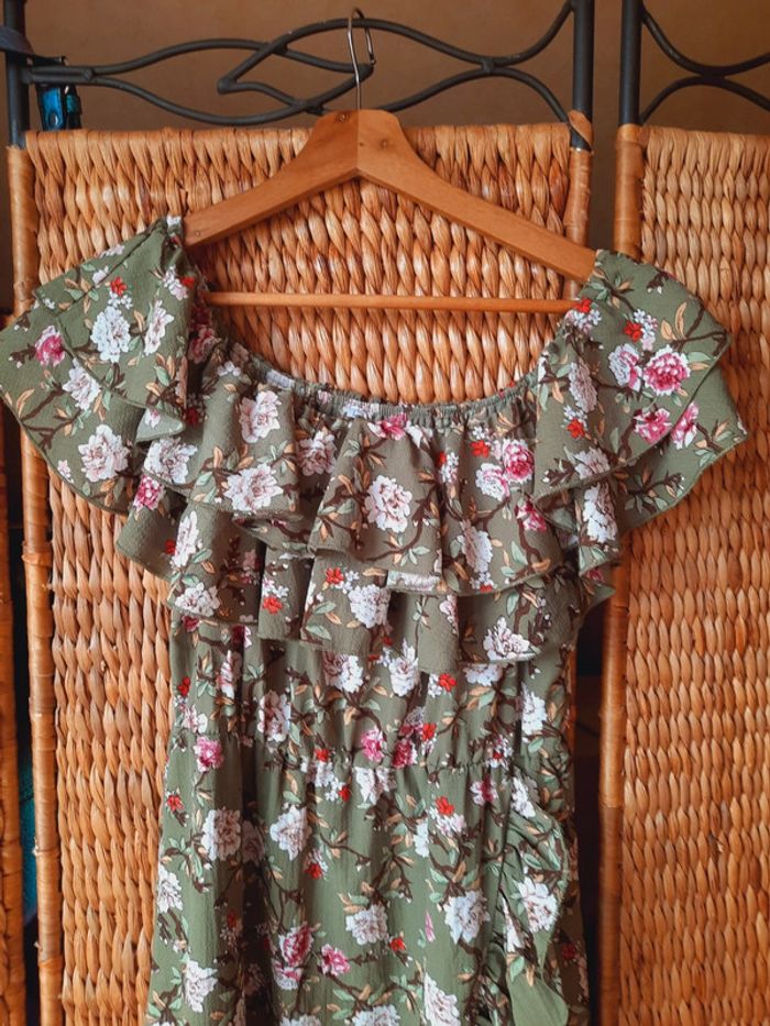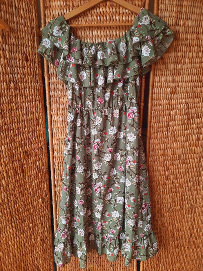 Robe mi longue, kaki à fleurs, col rond à volants élastique, élastique à la taille, longueur au dessus des chevilles, taille L, très bon état