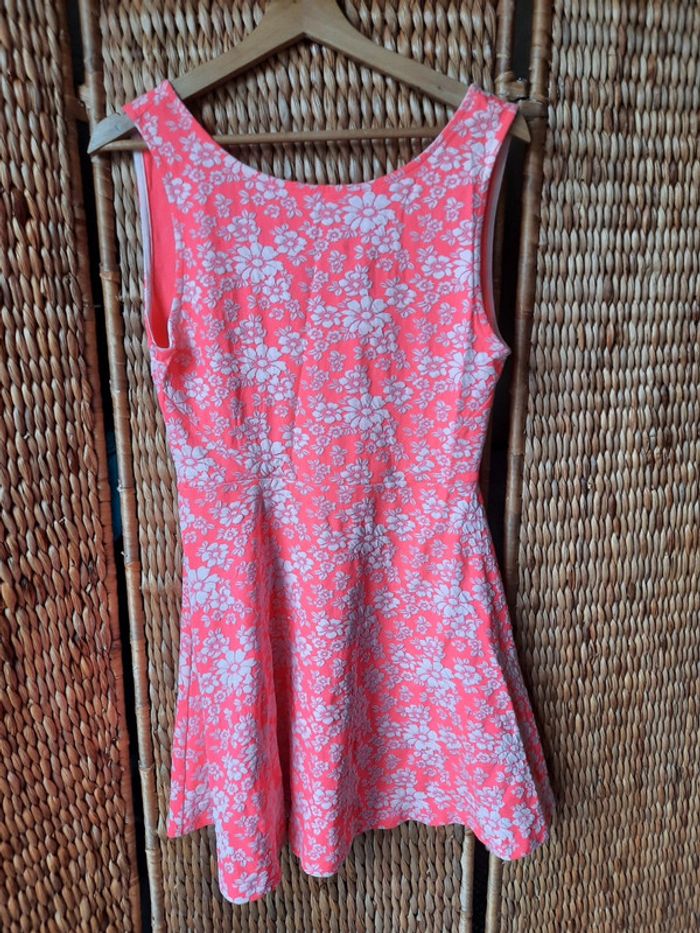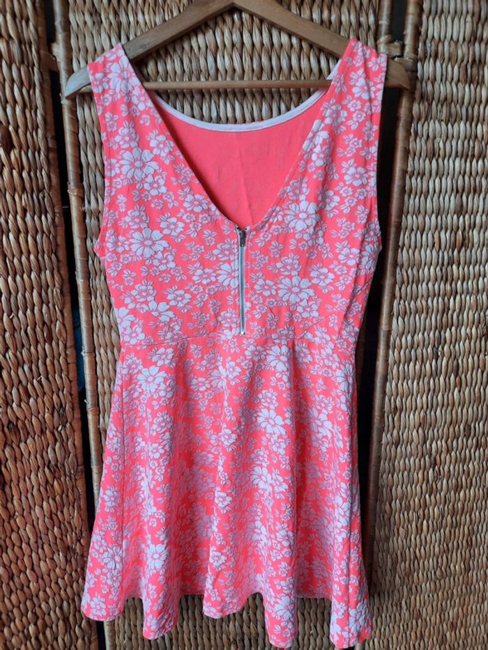 Robe d'été Divided, rose fluo à fleurs blanches, sans manches, fermeture éclair dans le dos, taille 40, très bon état