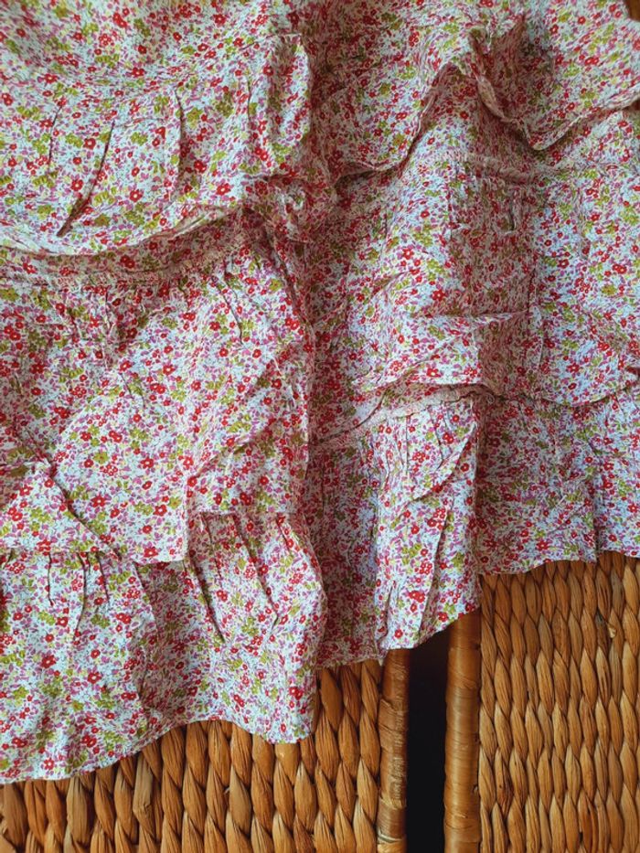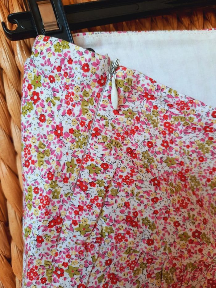 Mini jupe camaïeu à volants, petites fleurs roses, fermeture éclair sur le côté, taille M, très bon état