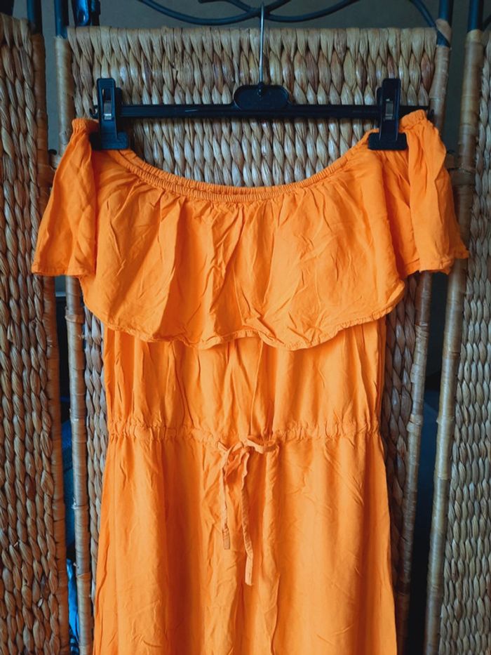 Robe longue Pimkie, orange, vitaminée, col bardot, laçage à la taille, tissus léger, légère transparence, taille 38/40, très bon état