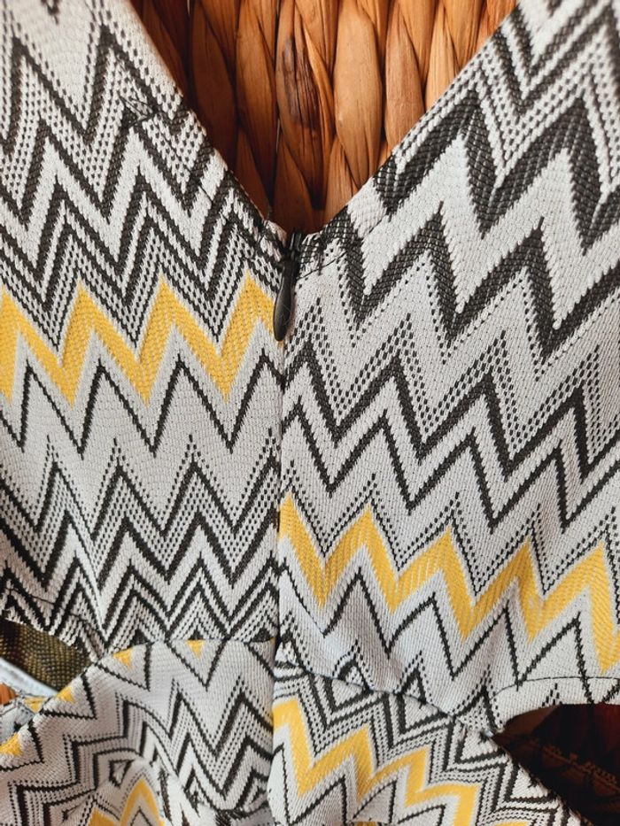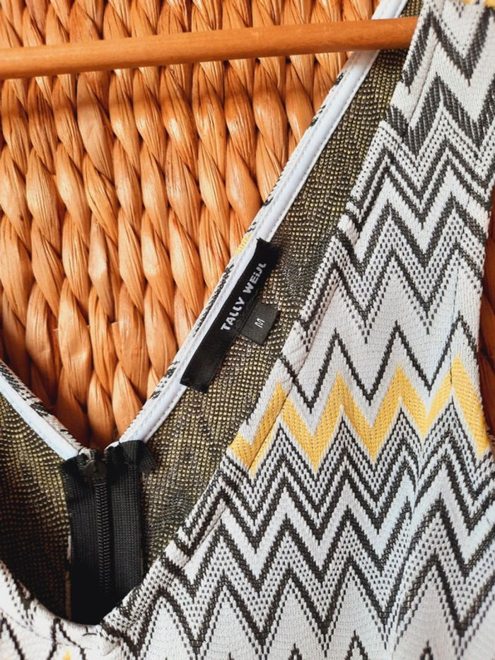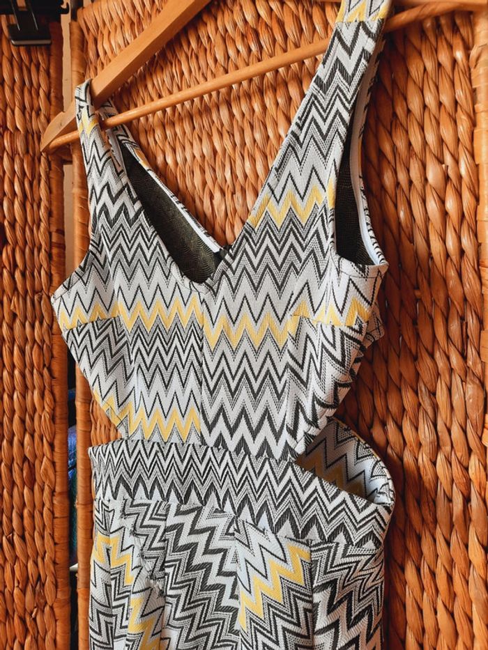 Robe Tally Weijl à chevrons, jaune, noire, ouverte sur les côtes, courte, taille M, un petit défaut (voir dernière photo)