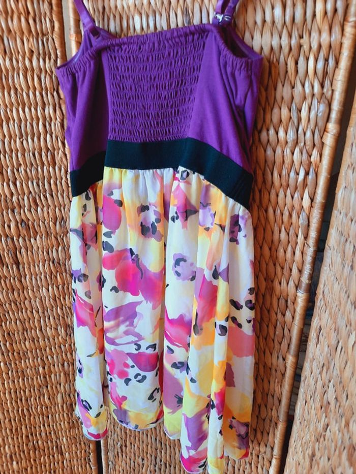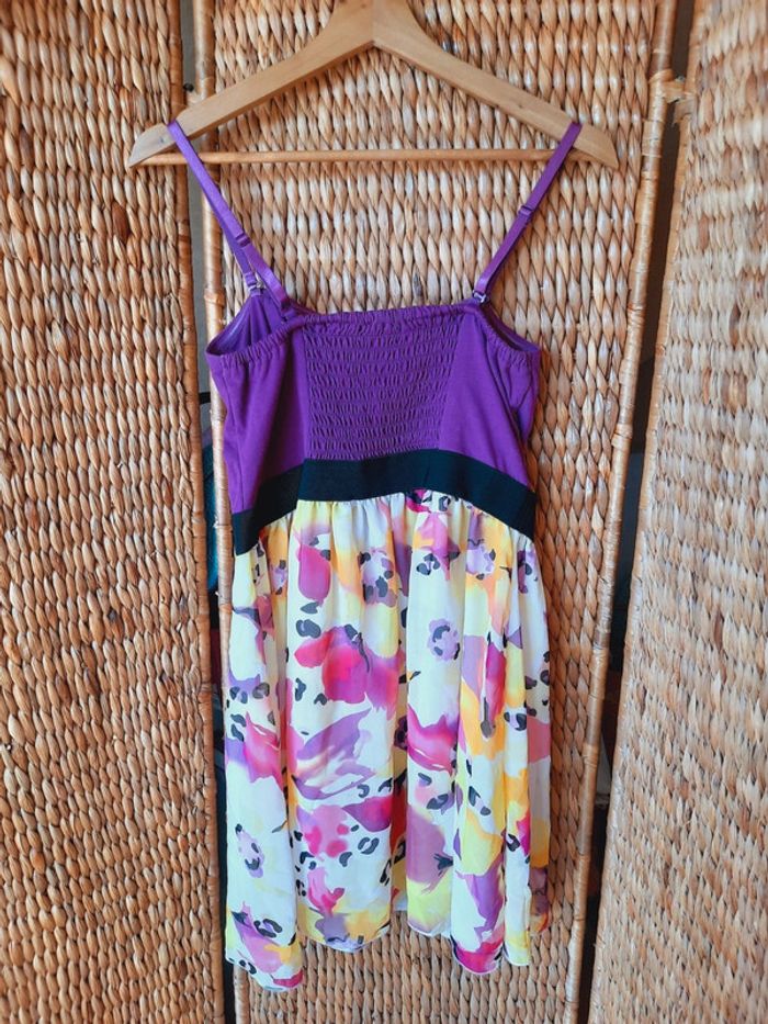 Robe Été Amisu, sans manches, fines bretelles réglables et amovible, buste violet et jupe fluide fleurie, dos avec élastique, taille 40, très bon état