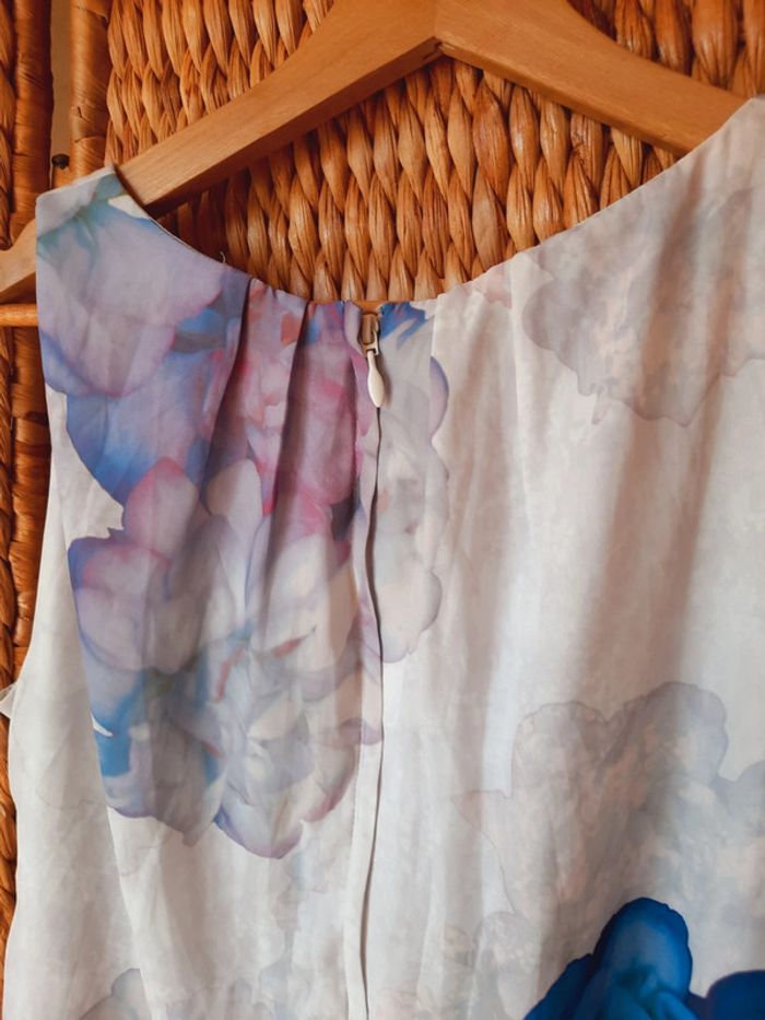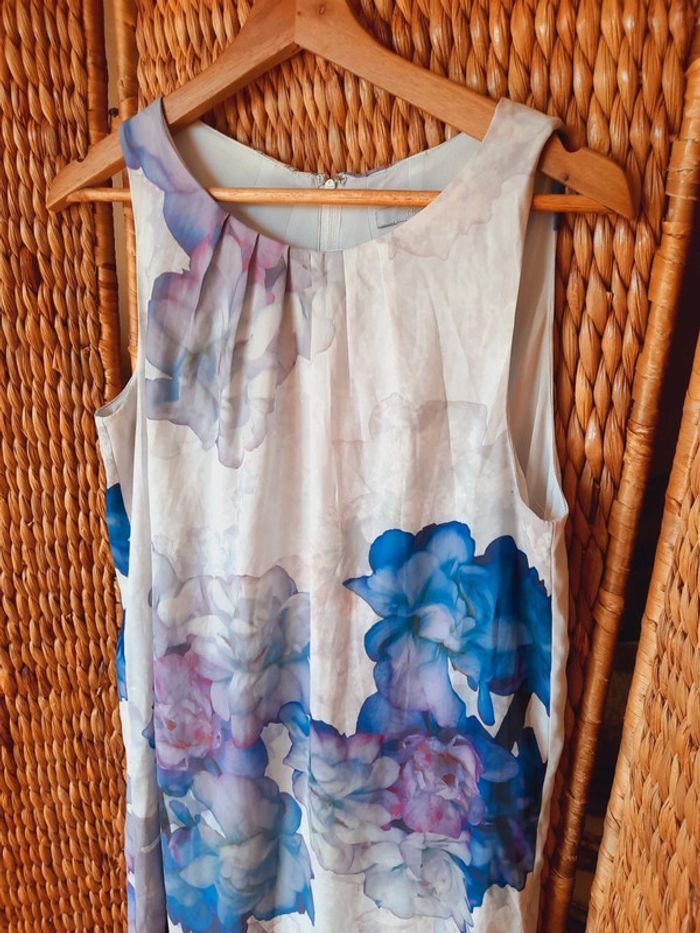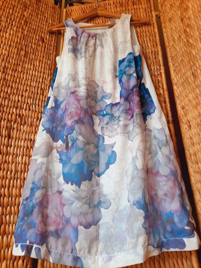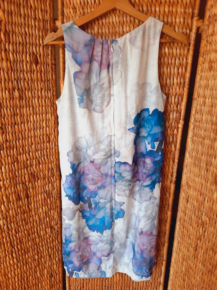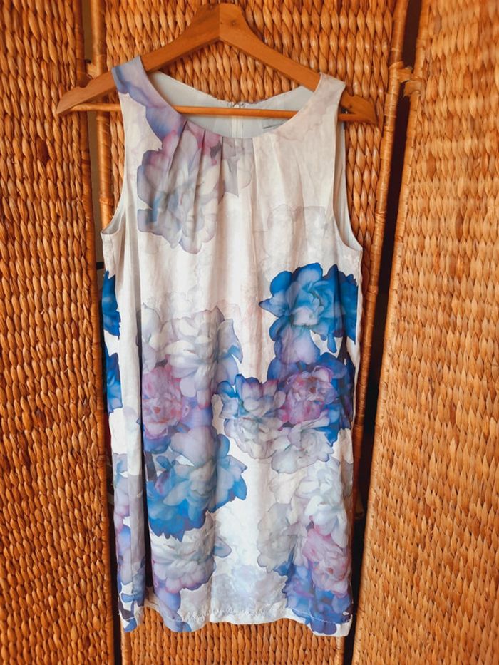 Robe d'été H&M, sans manches, fleurs bleues blanches violettes, doublée, tissus léger, fermeture éclair dans le dos, taille 38, très bon état