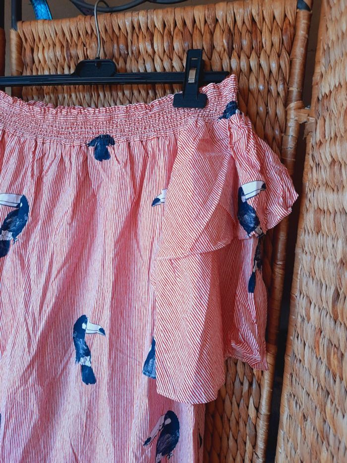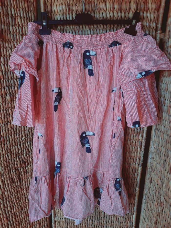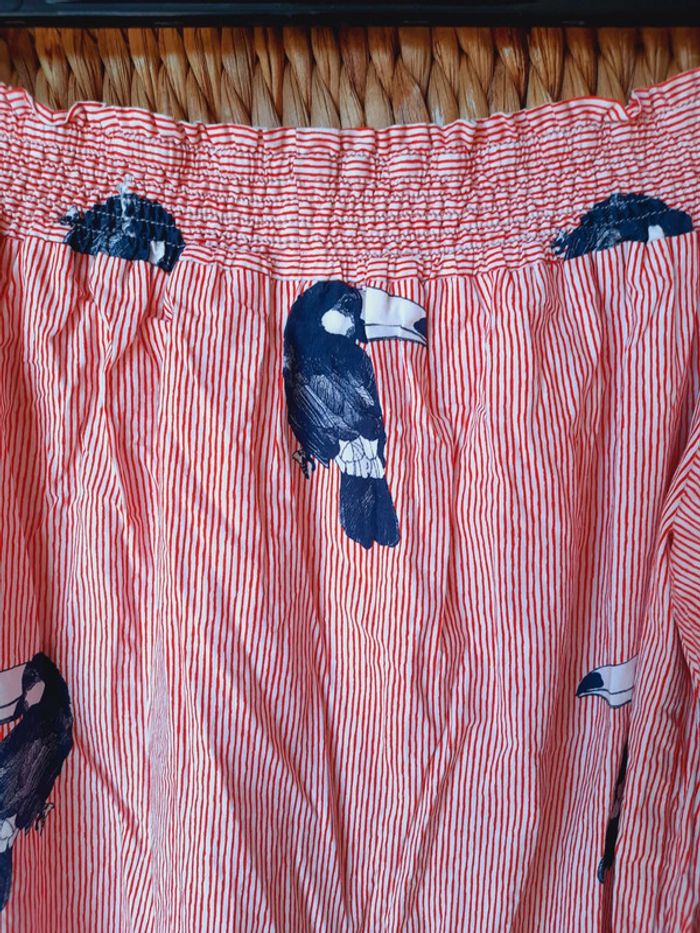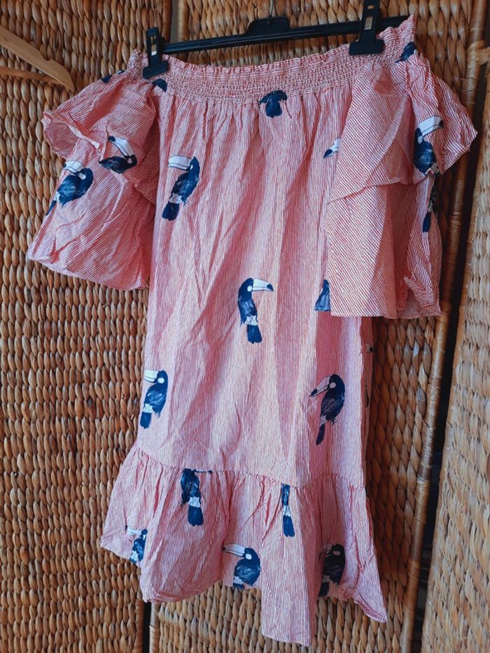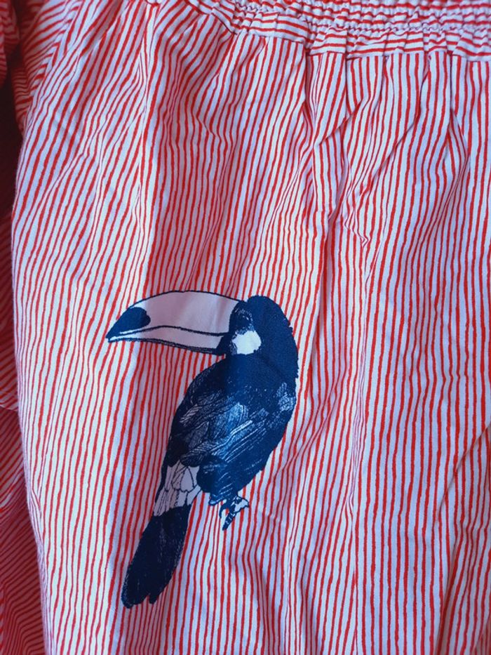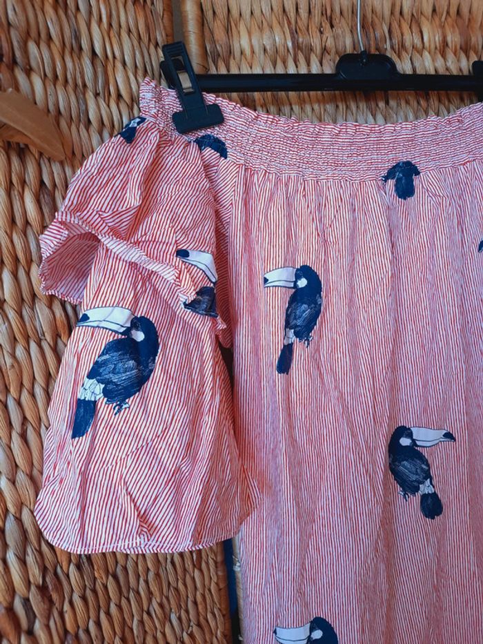 Robe tunique Zara Basic, rayée rouge et blanche à imprimés oiseaux, toucan, manches 3/4, col bateau, taille M, très bon état