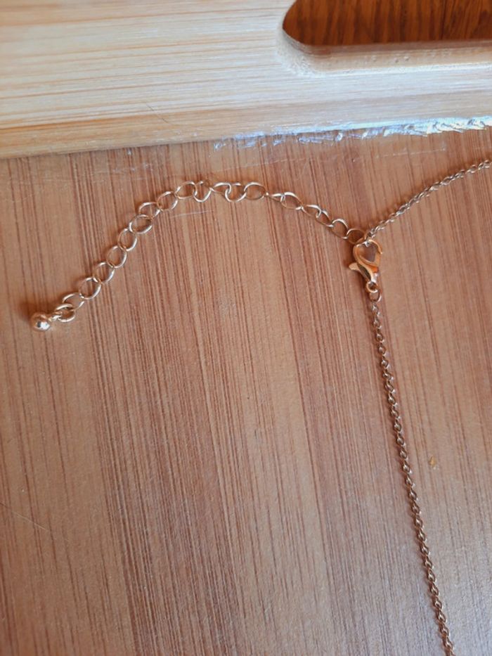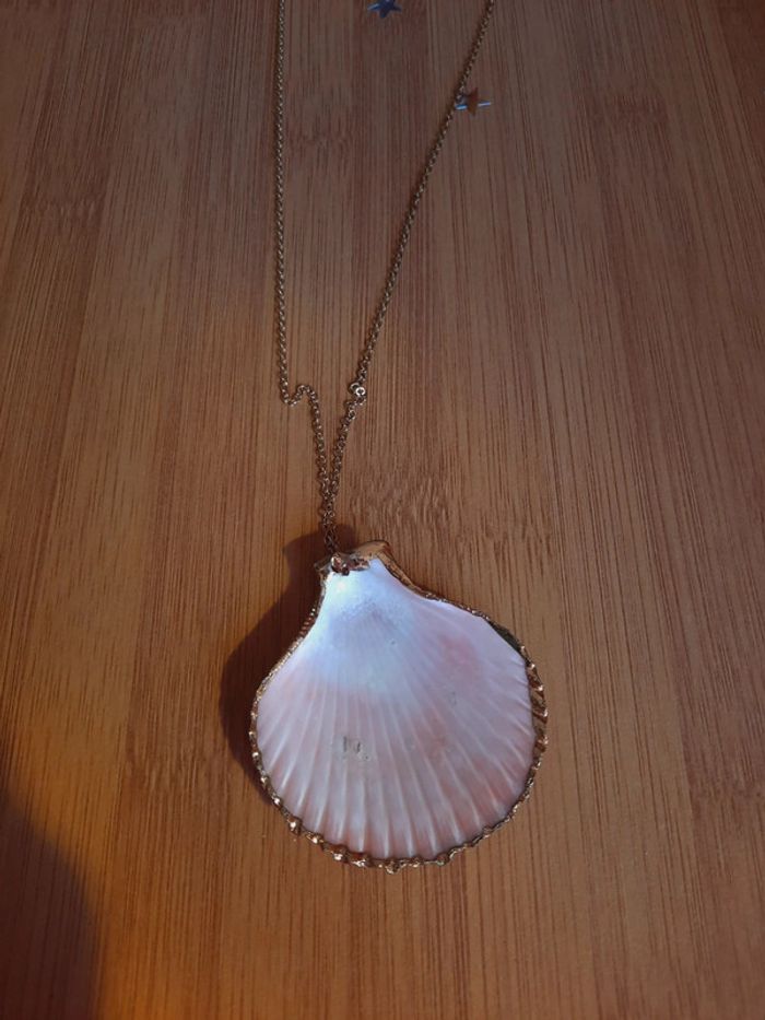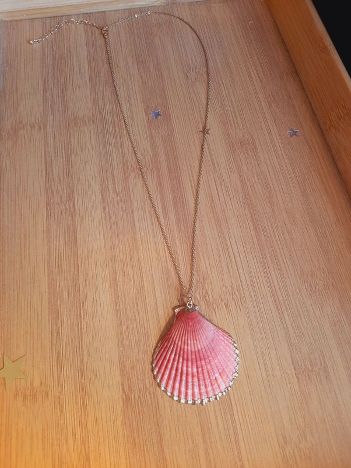 Collier sautoir petite chaînette dorée et pendentif coquillage Saint Jacques rose, comme neuf