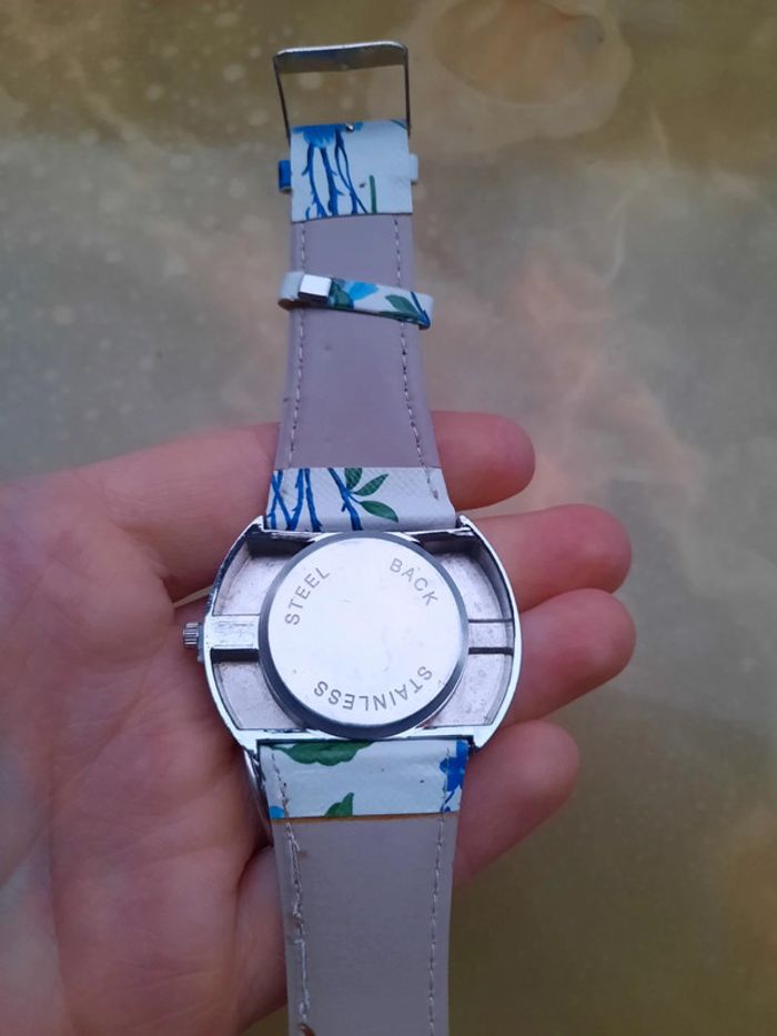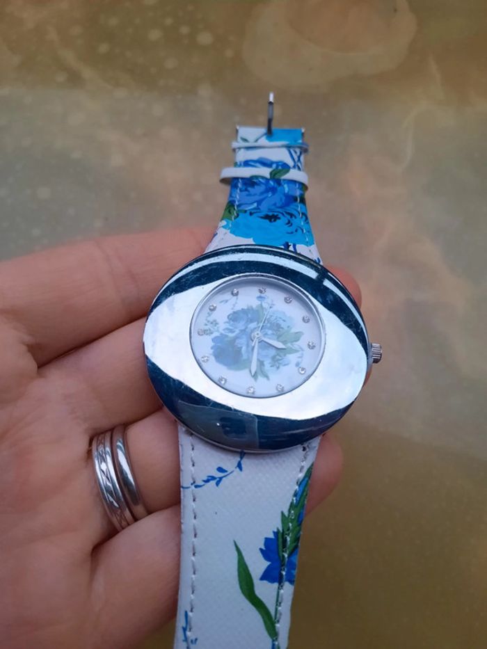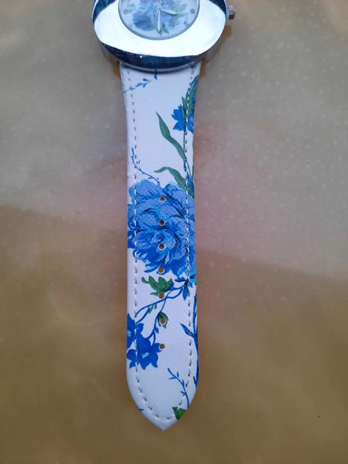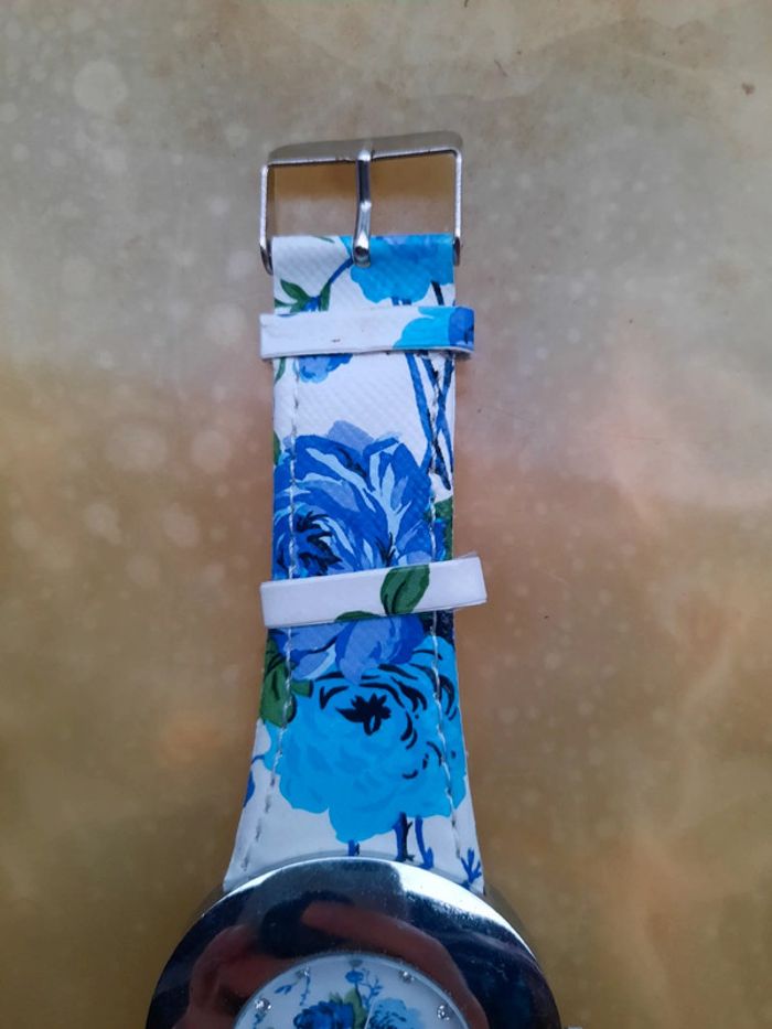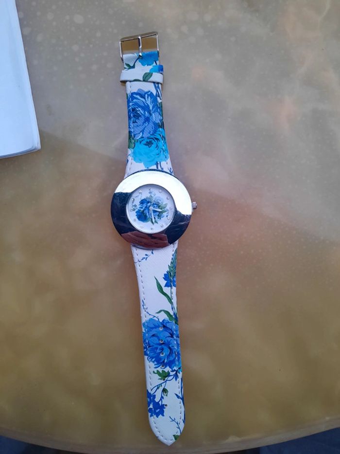 Montre fantaisie avec bracelet blanc à fleurs bleues, bon état, la partie argentée à quelques traces