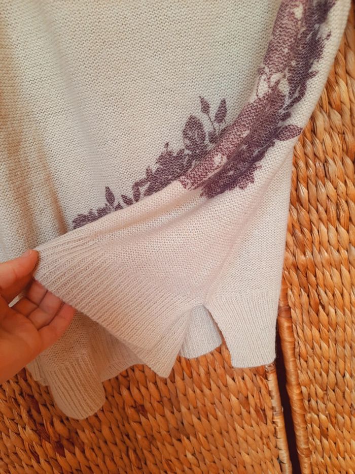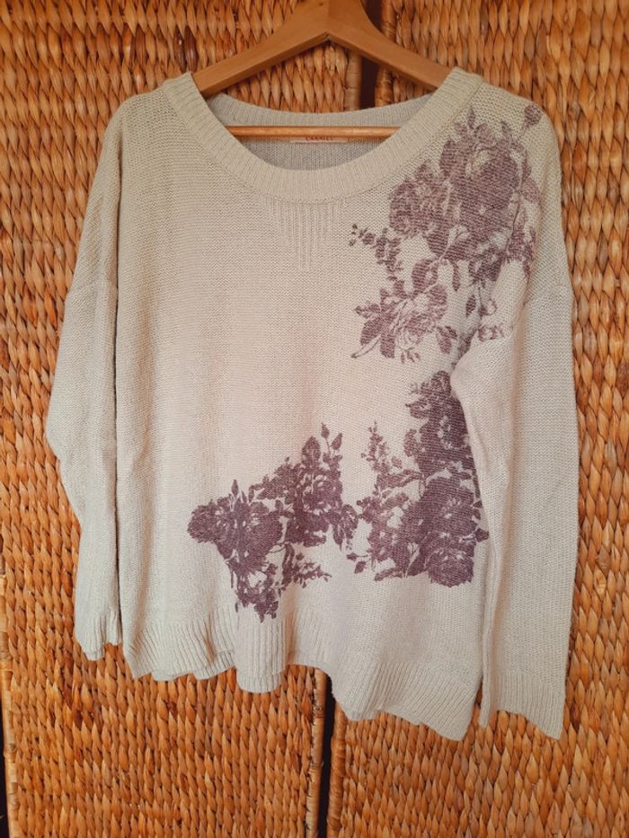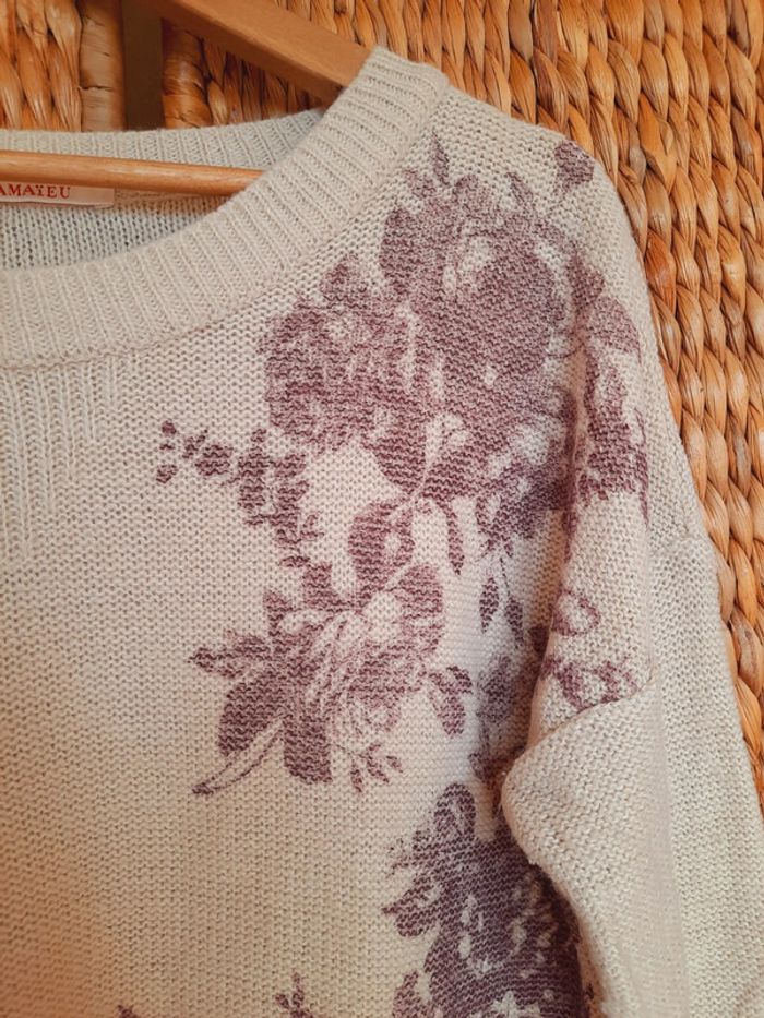 Pull Camaïeu, léger, beige imprimé fleurs prune, taille M/L, très bon état