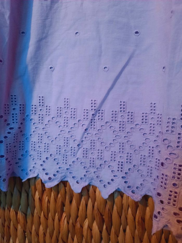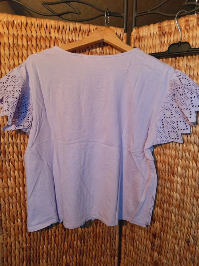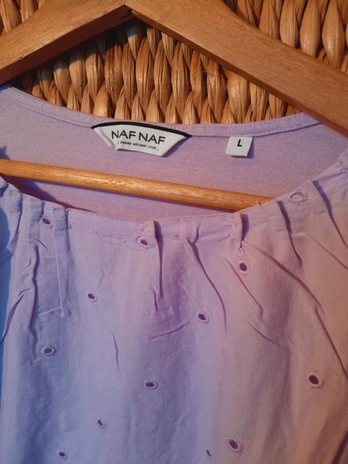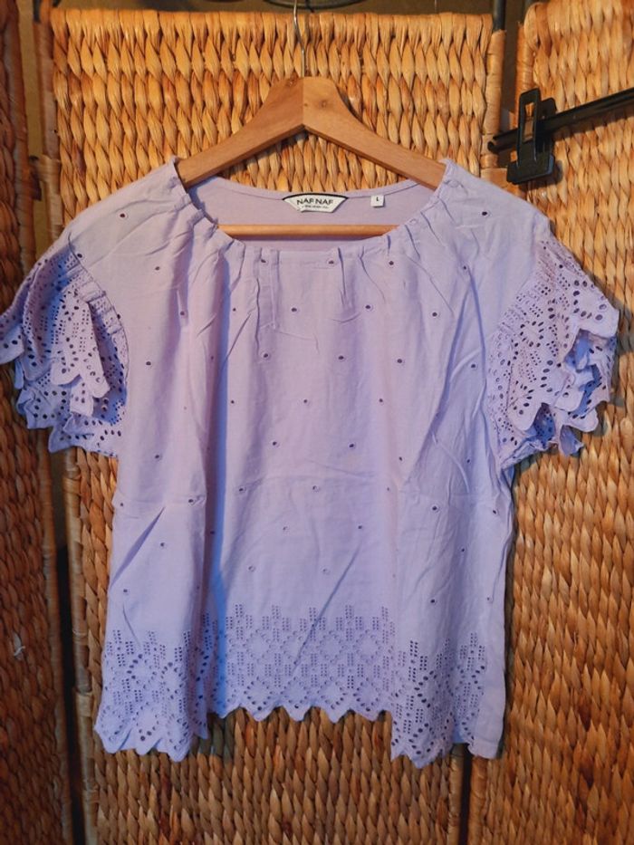 Blouse Naf-Naf lilas, manches courtes, ajourée et broderie anglaise, taille L, comme neuve