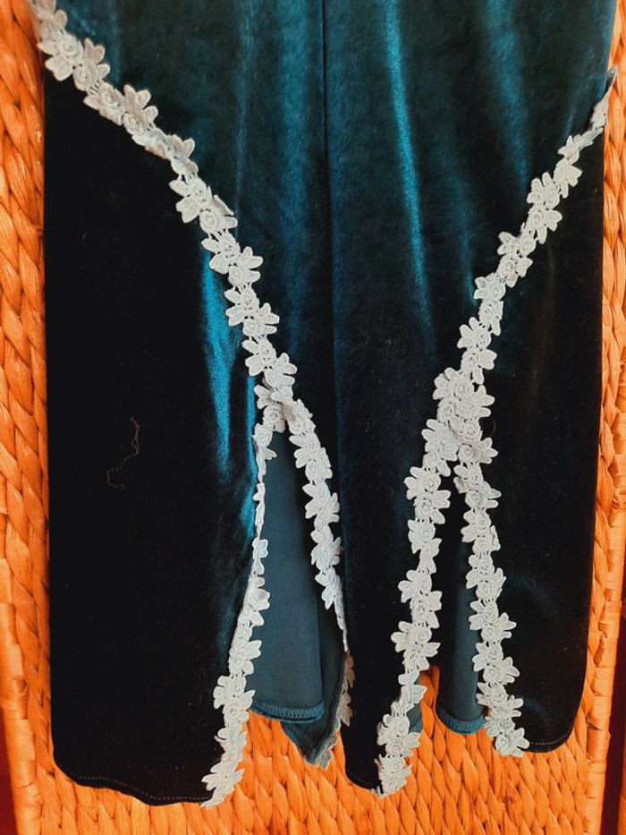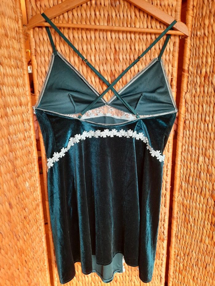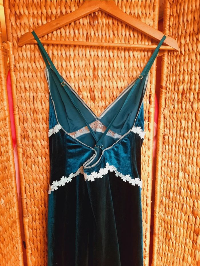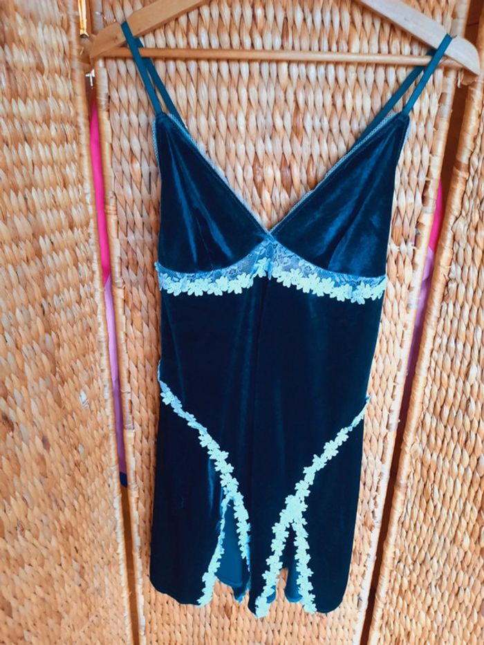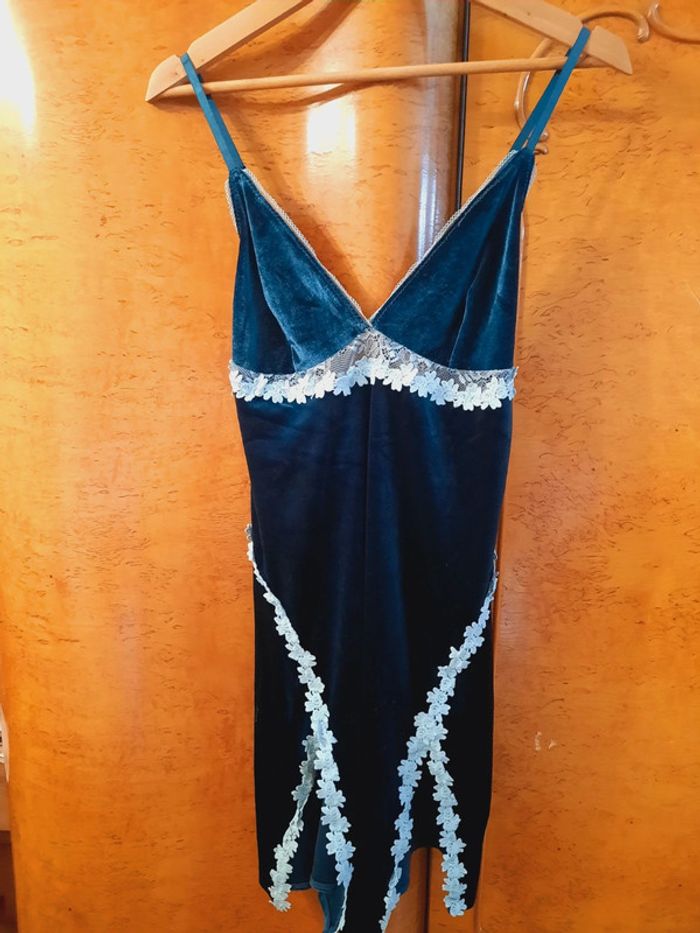 Nuisette en velours bleu canard, fines bretelles ajustables, croisées dans le dos, ouverte aux cuisses, taille M/L, excellent état