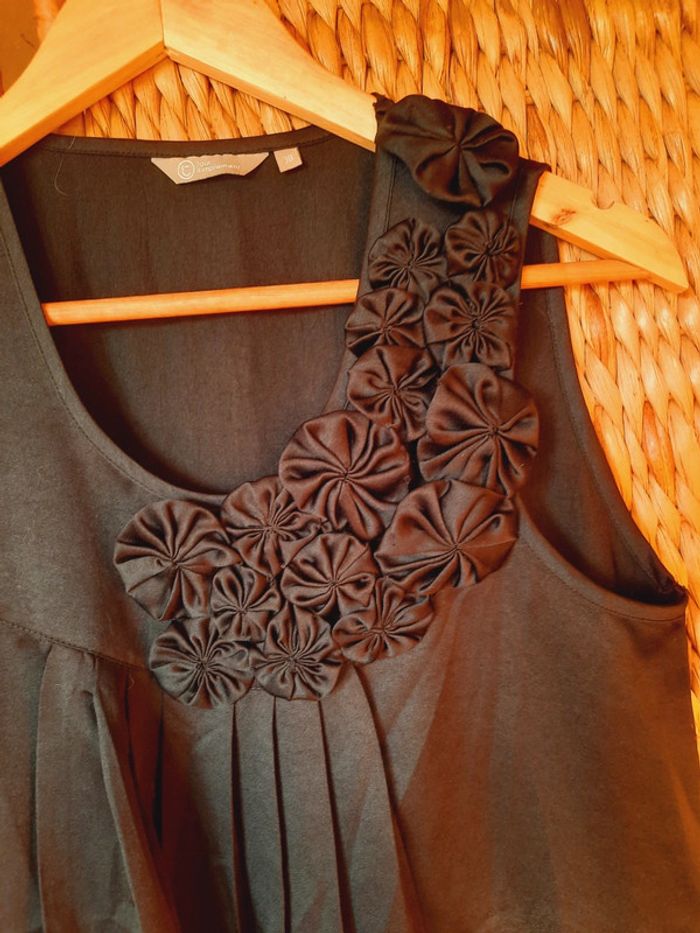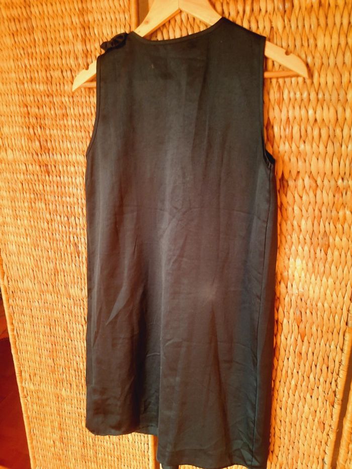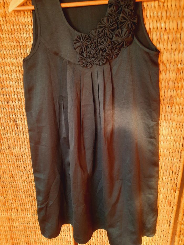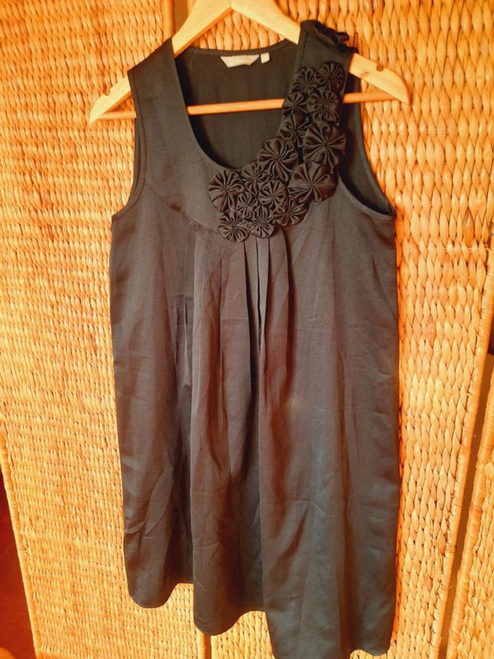 Robe tout simplement, noire, satinée, taille 38, sans manches, fleur en tissus sur l'épaule tombantes, très bon état