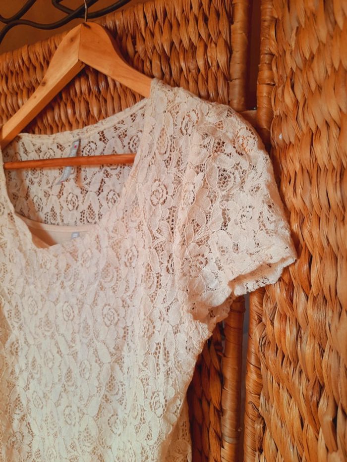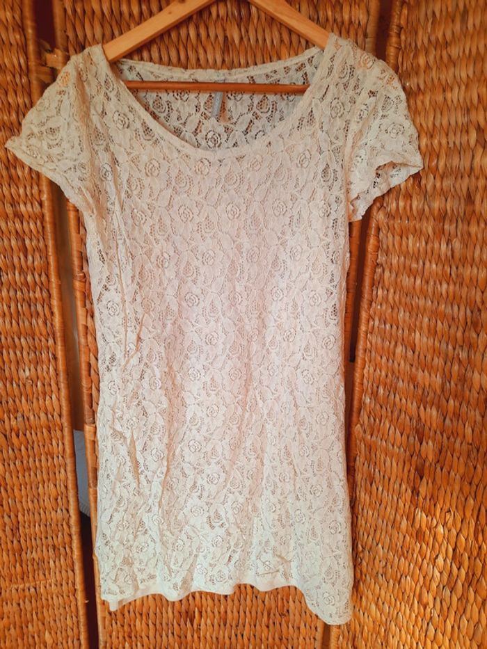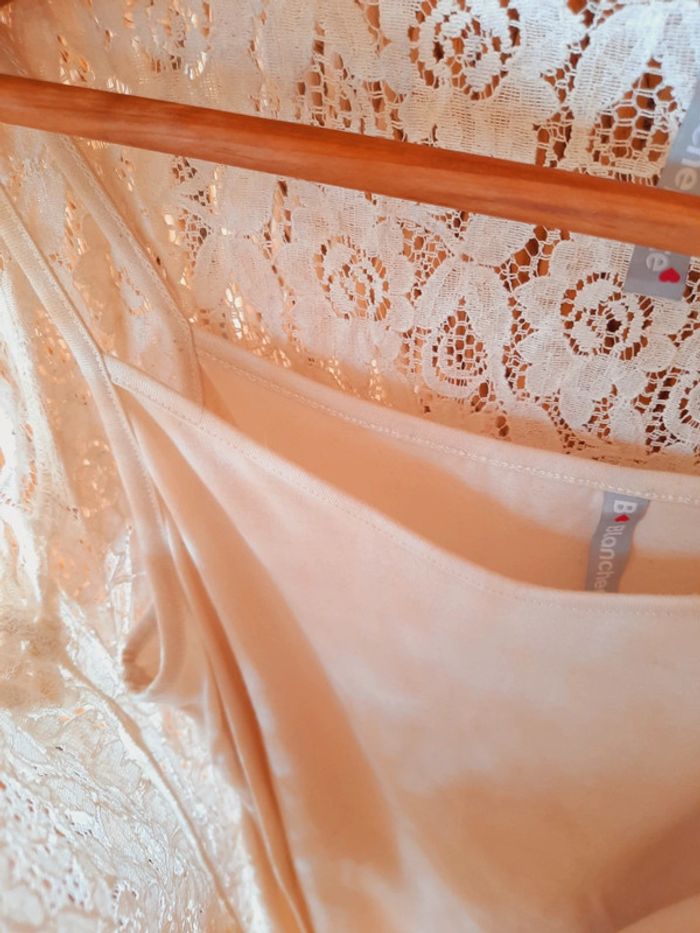 Robe manches courtes blancheporte, beige en dentelle, sous robe unie fines bretelles, taille 40, très bon état