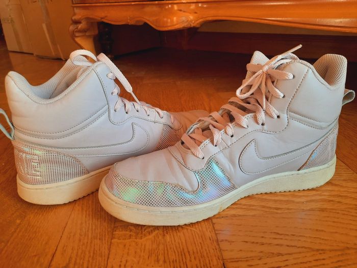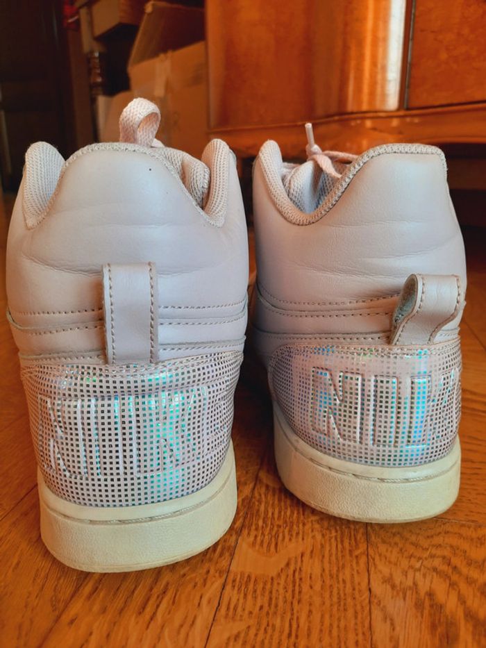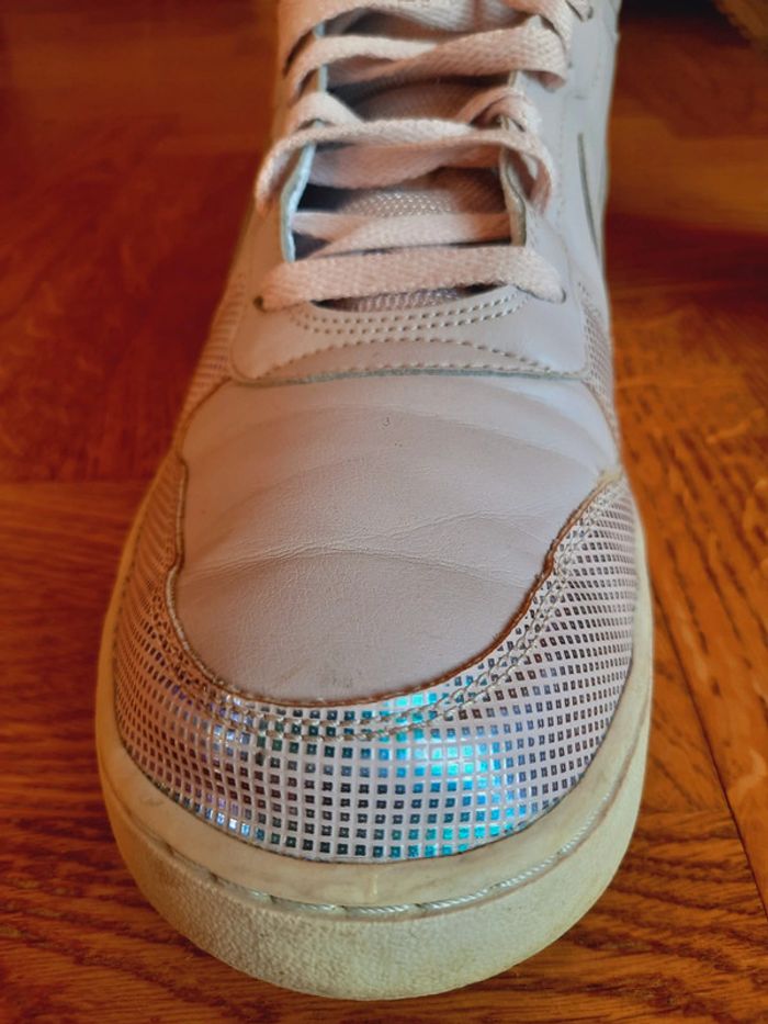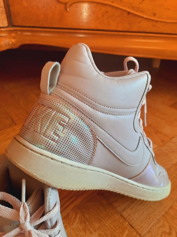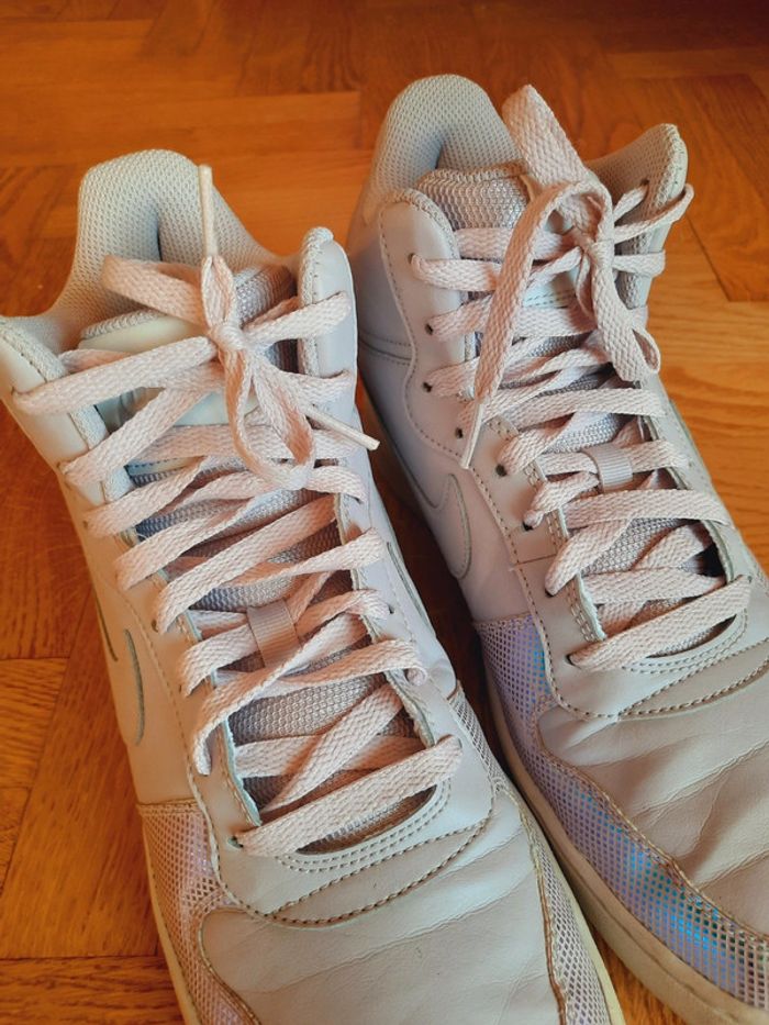 Baskets Nike rose poudrée, empiècements holographique, montantes, taille 43, très bon état, pièce rare / modèle court borough mid SE