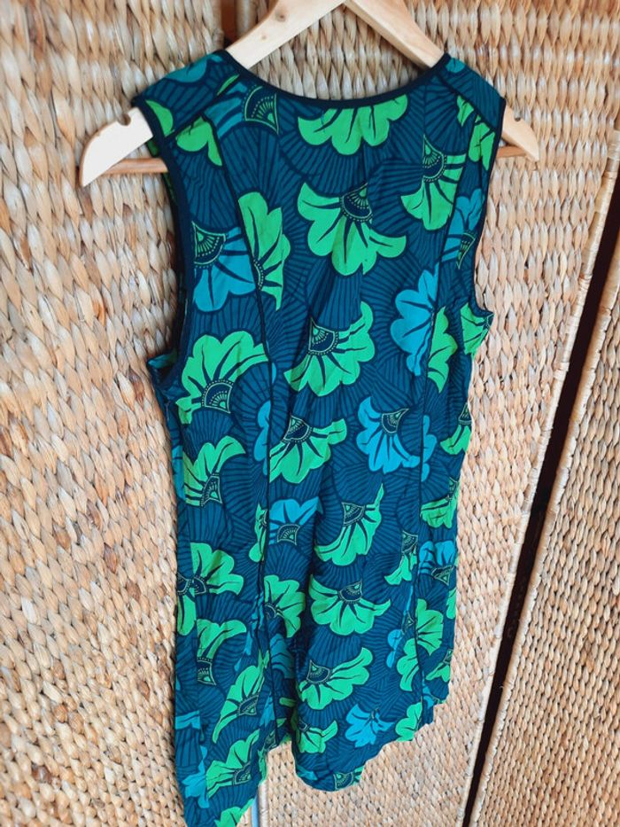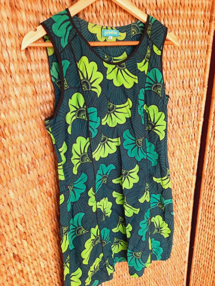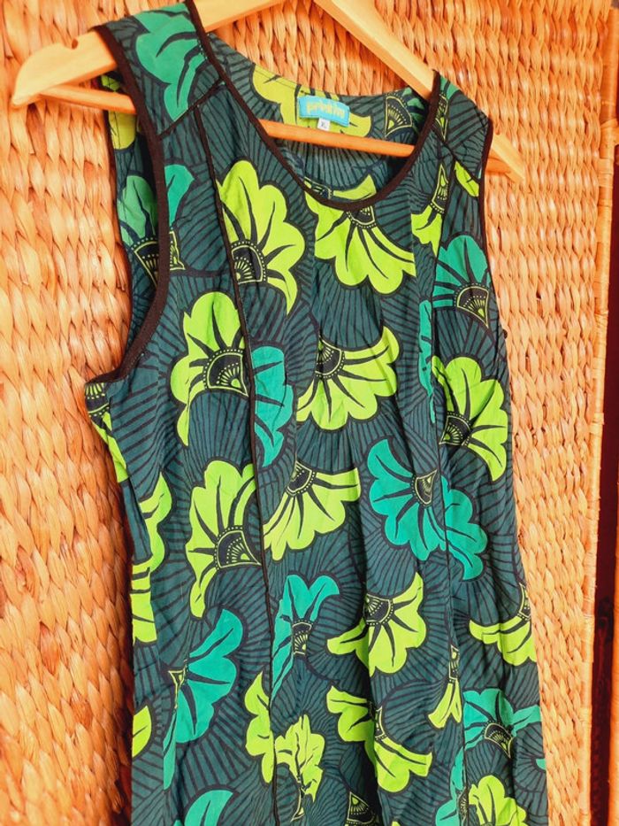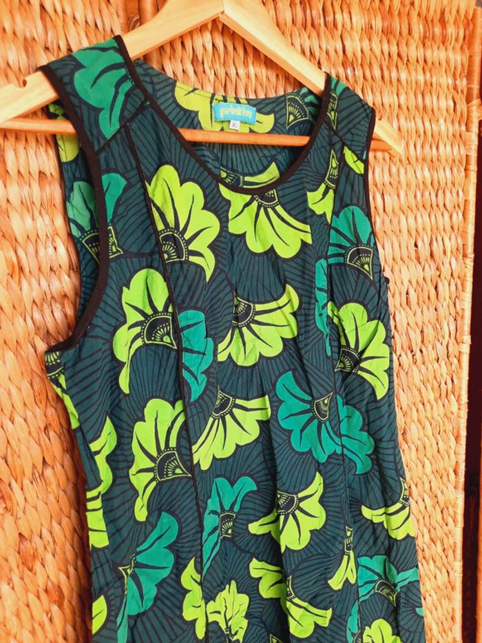 Robe d'été sans manches, Primitivo, fermeture éclair sous le bras gauche, motifs wax, verte et turquoise, taille XL, très bon état