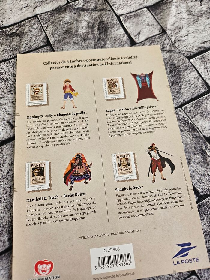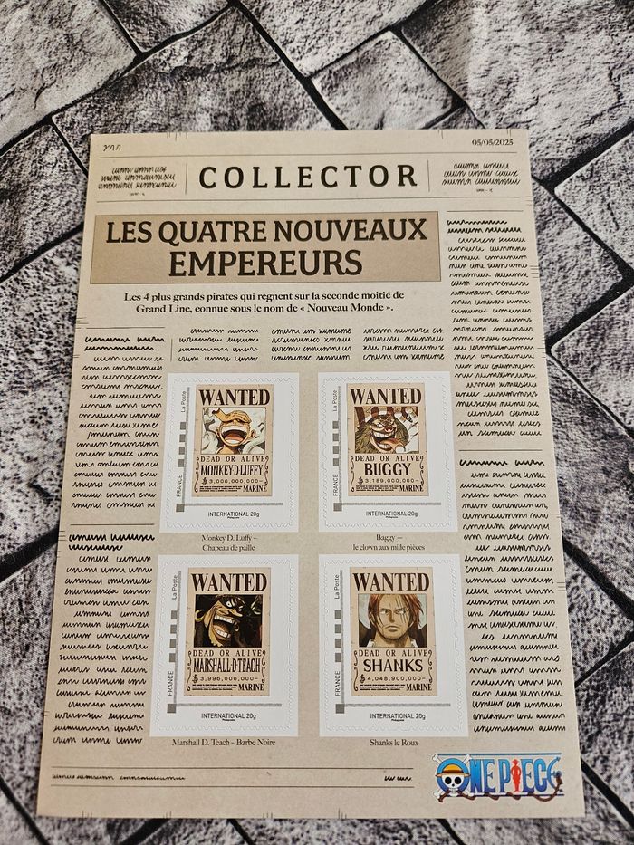 Annonce Spéciale – Collection Internationale de Timbres One Piece ! Les Quatre Nouveaux Empereurs s’invitent dans votre collection ! Découvrez une édition collector internationale exclusive mettant en vedette les quatre pirates les plus puissants du Nouveau Monde : Monkey D. Luffy – Le légendaire chapeau de paille Buggy le Clown – Le capitaine fantasque au destin surprenant Marshall D. Teach (Barbe Noire) – Le plus redoutable des empereurs Shanks le Roux – Le mystérieux capitaine à la force tranquille Ces timbres internationaux 20g, inspirés des affiches « Wanted » emblématiques, sont un hommage à l’univers de One Piece et aux 4 souverains de la seconde moitié de Grand Line. Édition limitée - Ne ratez pas votre chance de naviguer avec les empereurs du Nouveau Monde ! Collection officielle - Valable pour envoi international - France / Monde entier
