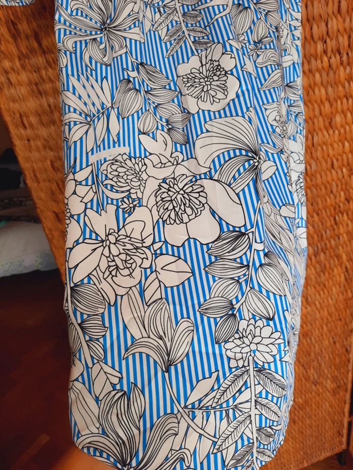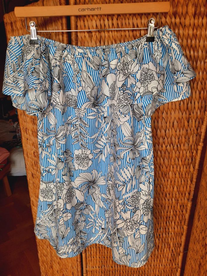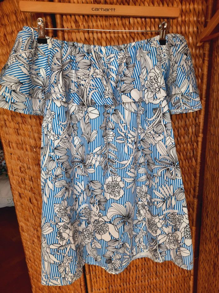 Robe rayée col bardot, bleue et blanche, à fleurs, tissus effet satiné, taille L, très bon état