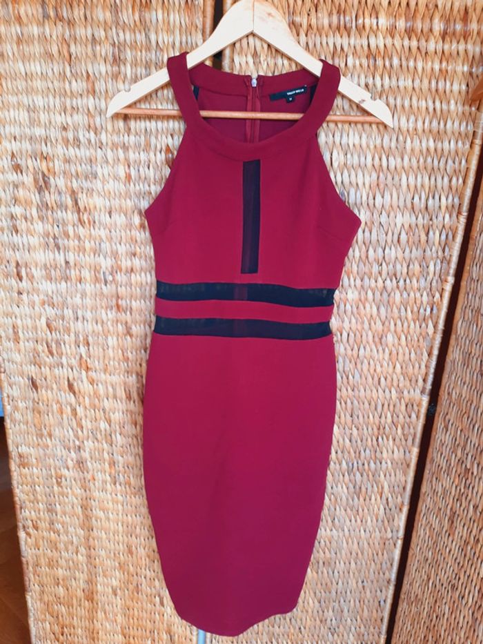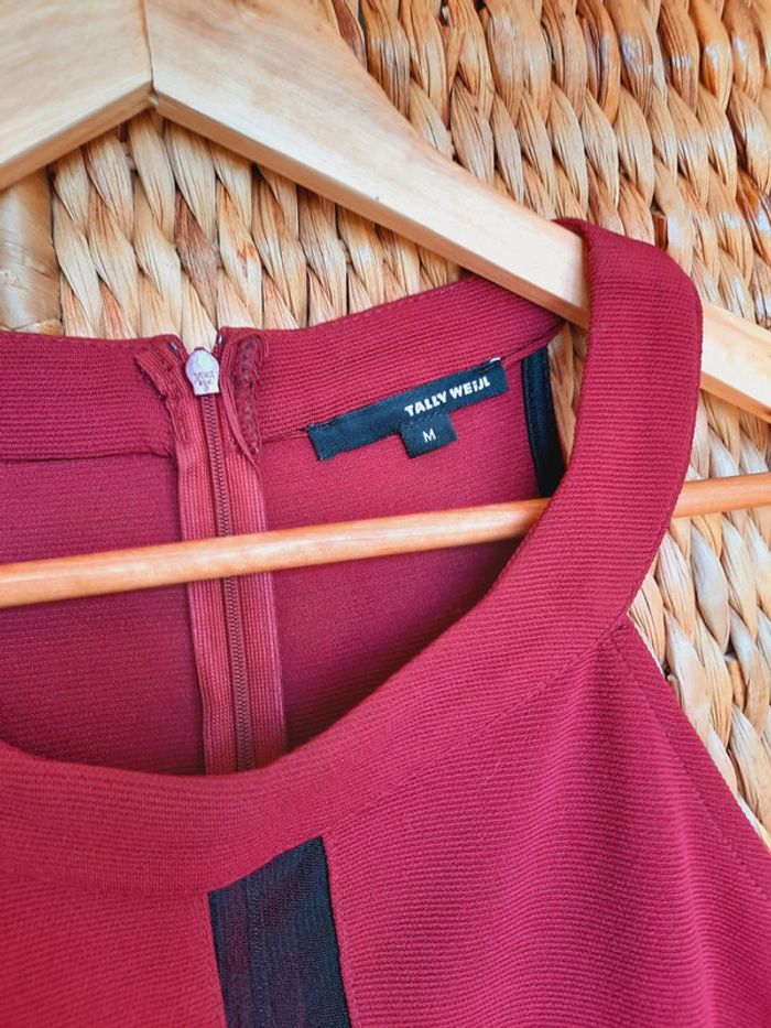 Robe Tally Weijl, bordeaux, fermeture éclair dans le dos, sans manches, tulle noir sur le buste et la taille, tissus en excellent état, les coutures sont un peu defaites au niveau du tulle (voir photo), taille M
