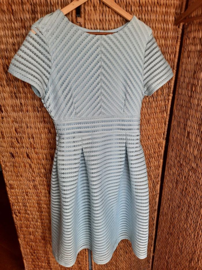 Robe Boohoo bleu ciel, double épaisseur, coupe midi, chic, manches courtes, fermeture éclair dans le dos, taille 42, neuve jamais portée, longueur épaule 108 cm