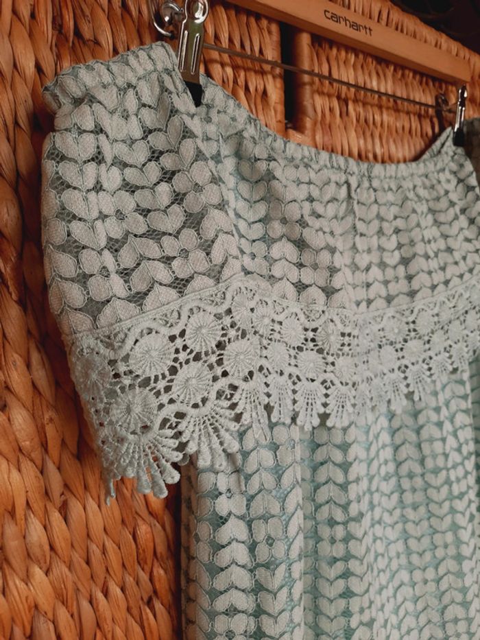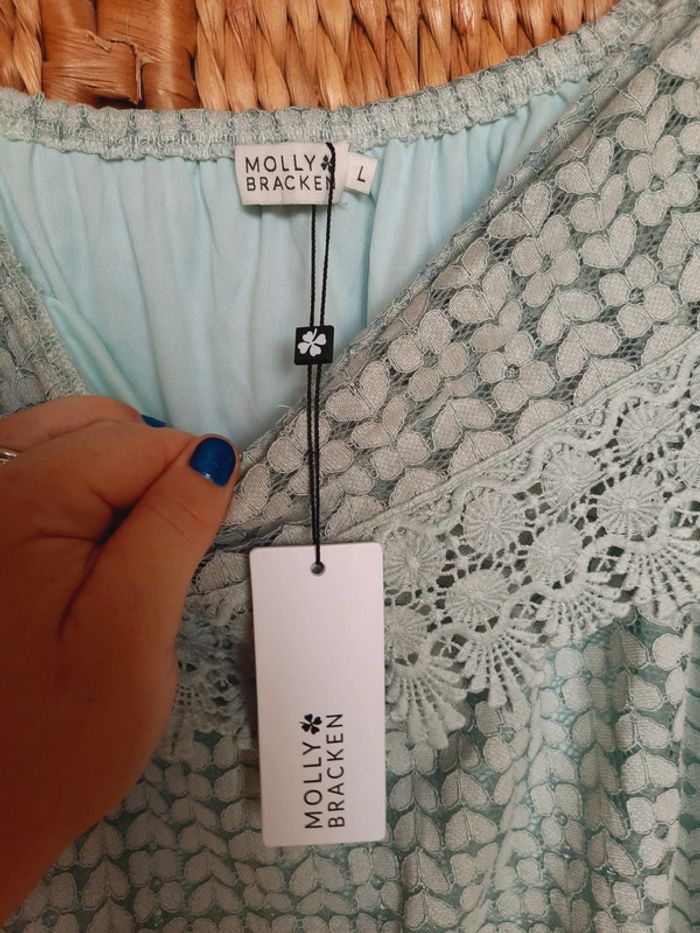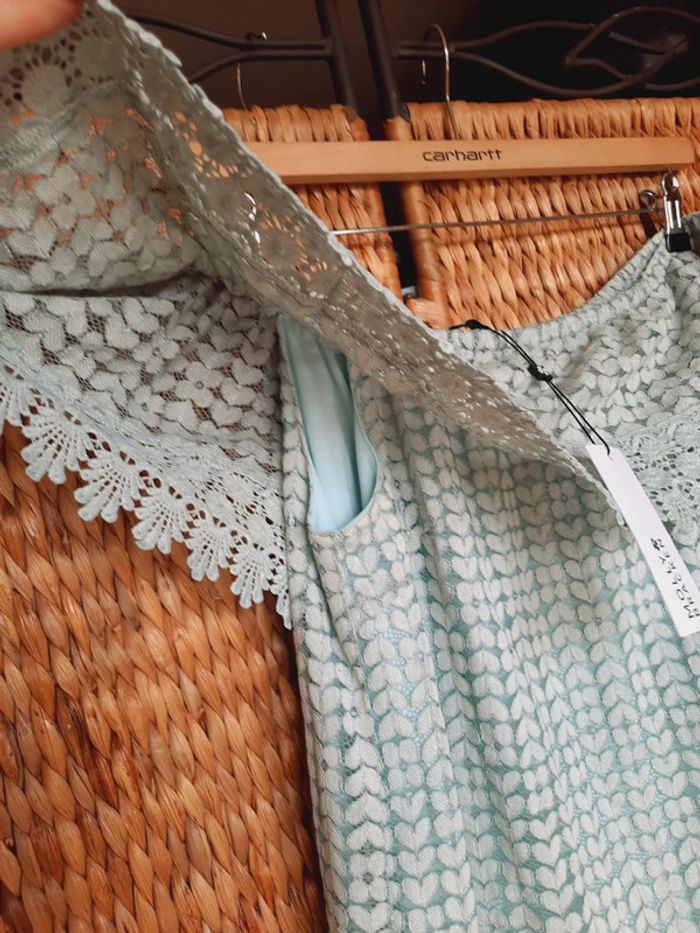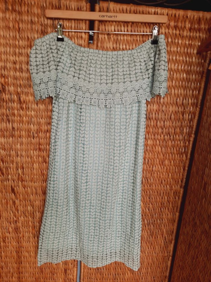 Robe chic Molly Bracken col bardot, couleur vert d'eau, tissus dentelé, avec sous robe, taille L, neuve avec étiquette