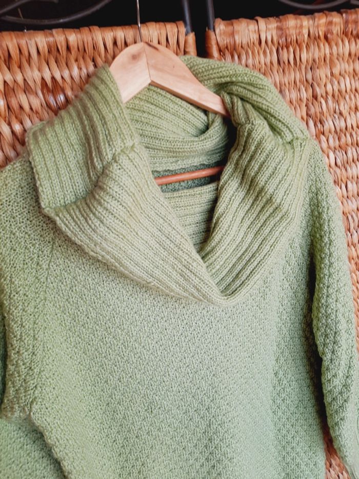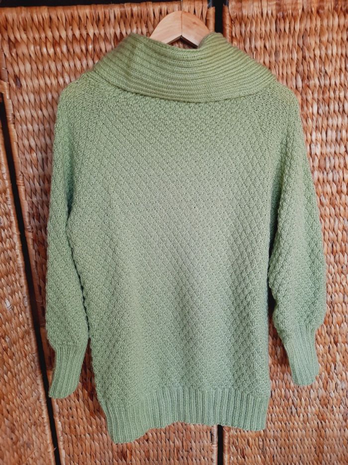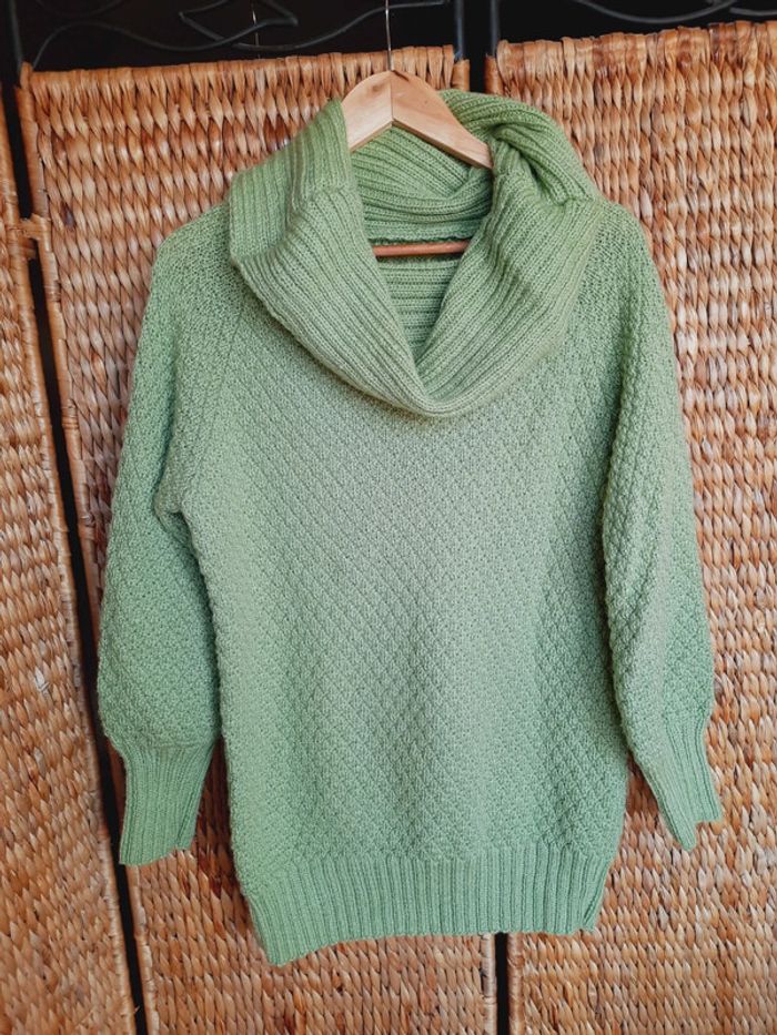 Pull long tricoté main, joli point, manches resserrées aux poignets, col à enrouler, vert anis, taille L/XL, très bon état