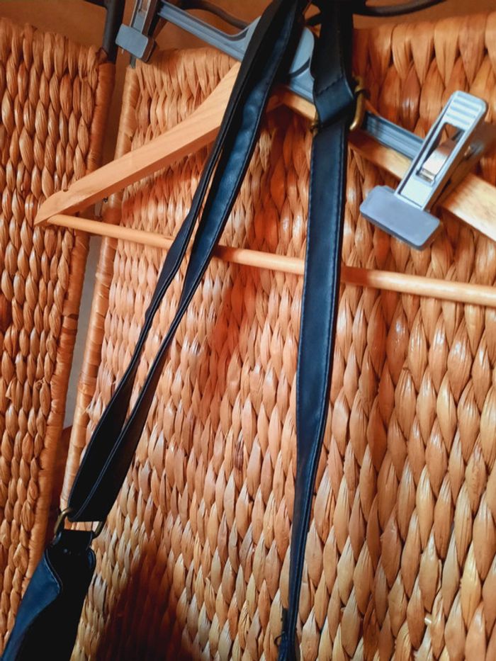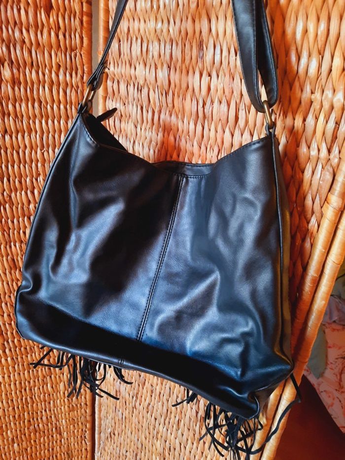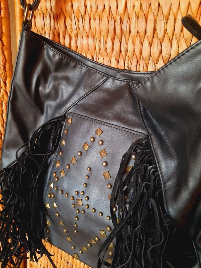Sac Bandoulière Mim, noir avec franges et clous dorés, simili cuir, bandoulière réglable, excellent état