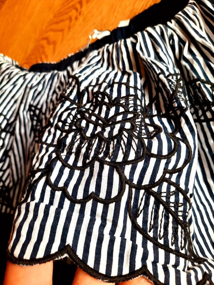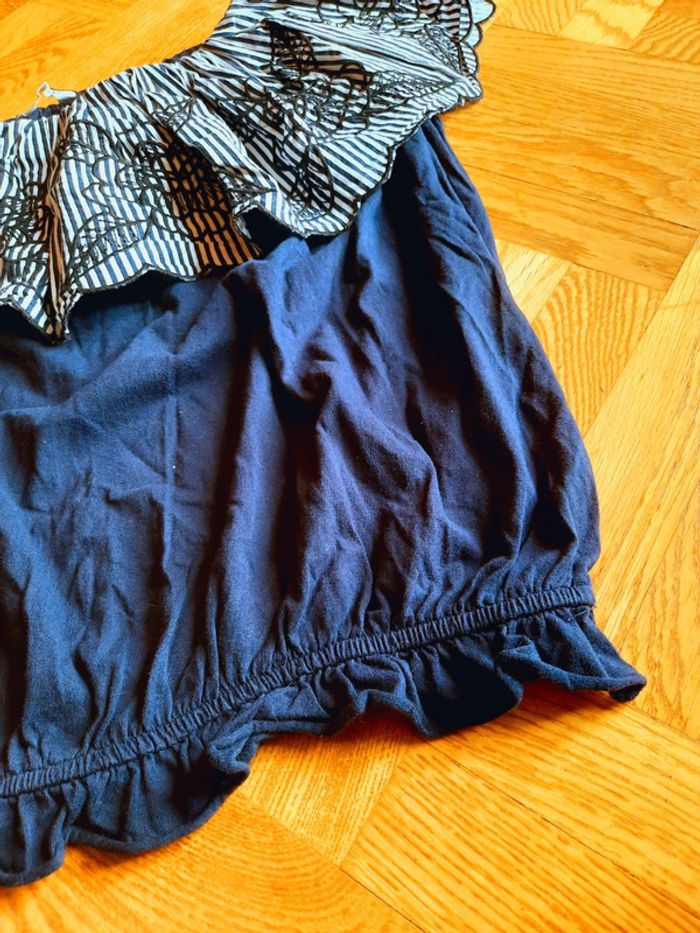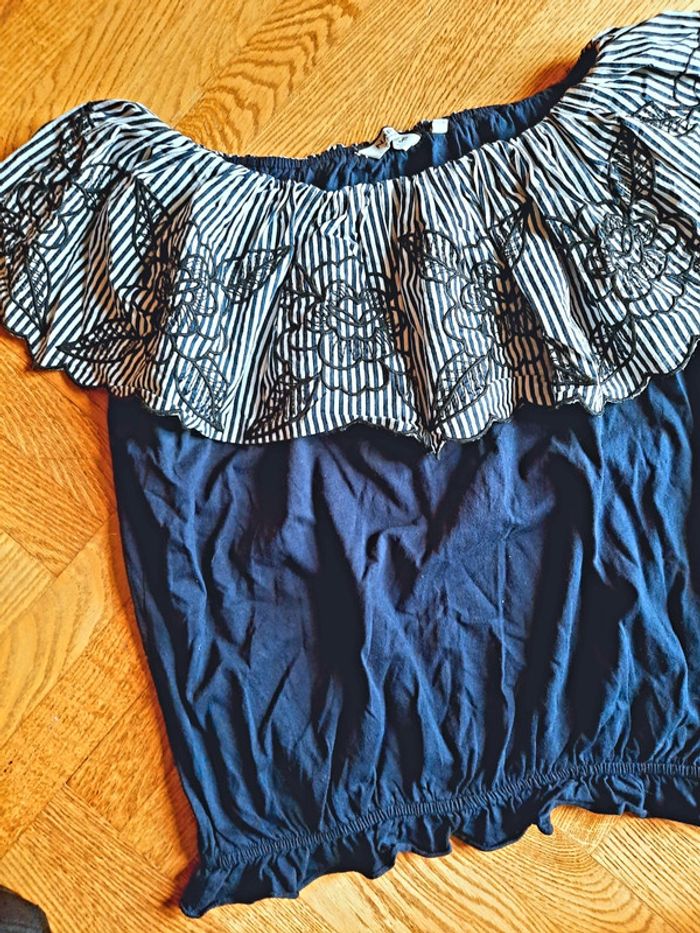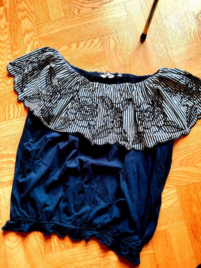 T-shirt Naf Naf, bleu marine à grand col rabattu, col rayé et brodé, taille L, état impeccable