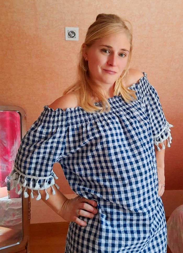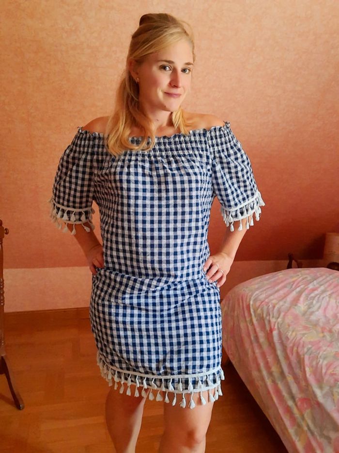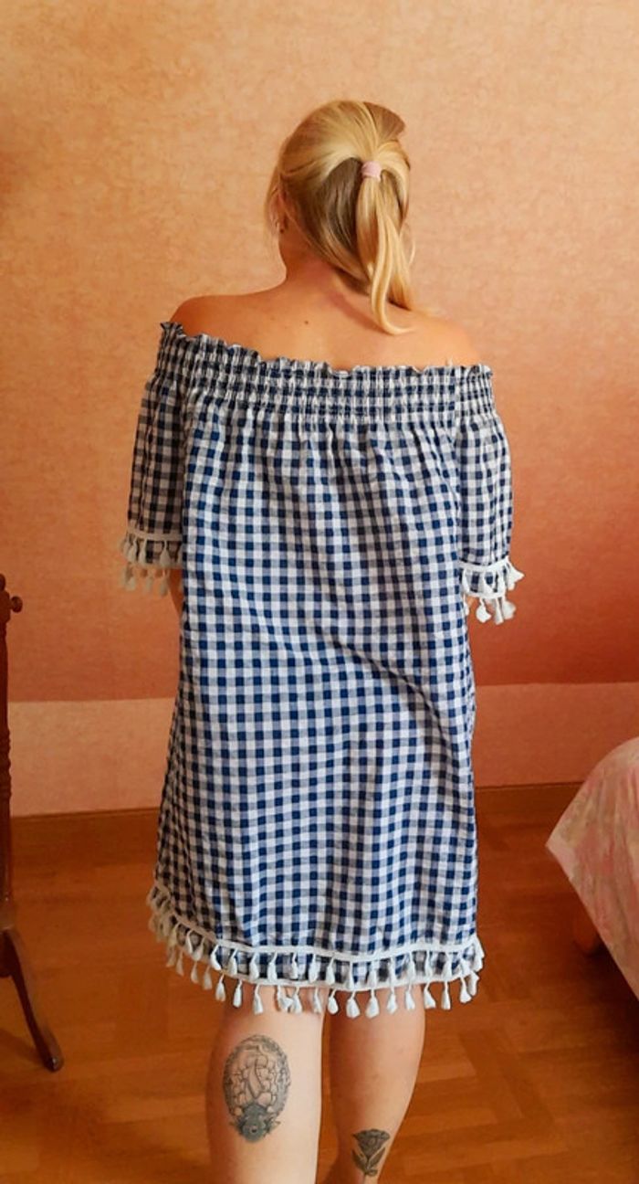Robe à carreaux bleue et blanche, col bateau, pampilles blanches, taille L, très bon état