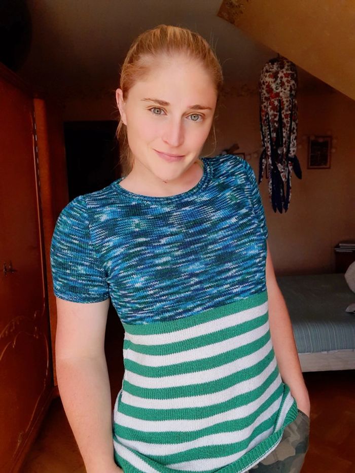 T-shirt maille, tricoté main, rayé vert et blanc, et turquoise, taille M/L, très bon état