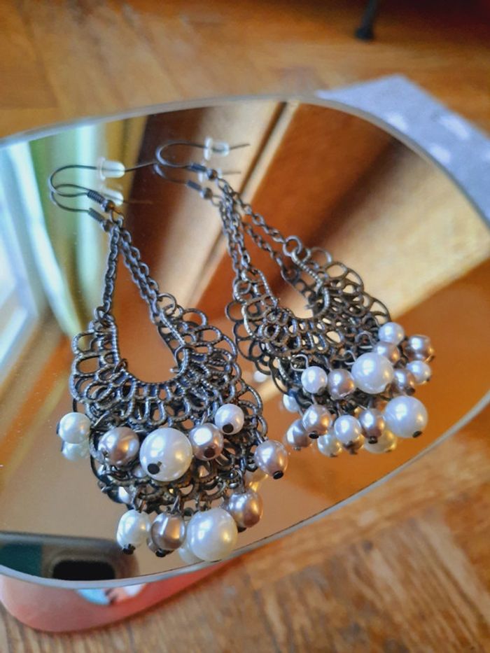 Boucles d'oreilles pendantes, métal bronze et perles nacrées, très bon état