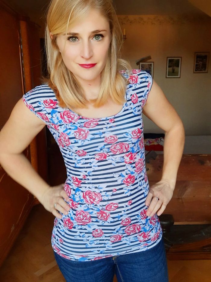 T-shirt Clockhouse rayé, à fleurs, roses rouges, taille M, très bon état