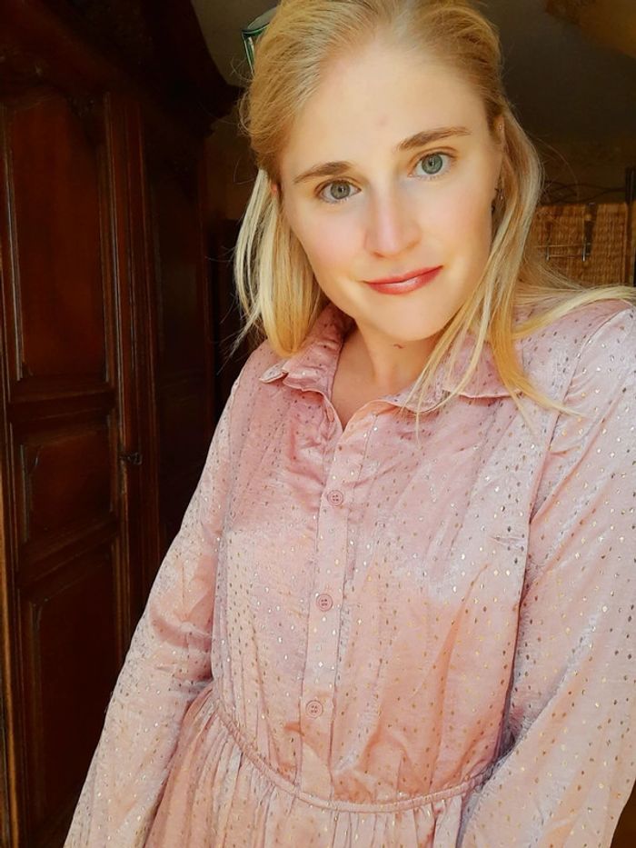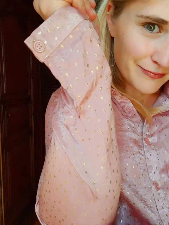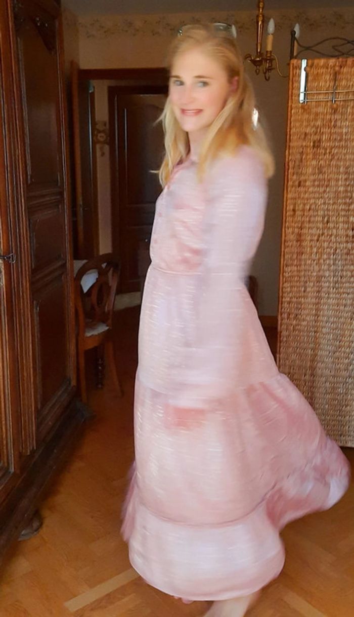 Robe longue en satin, vieux rose à pétales dorées, col de chemise avec boutons, élastique à la taille, toute douce, taille L