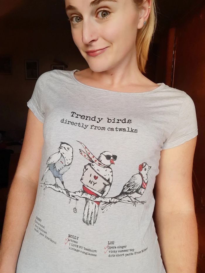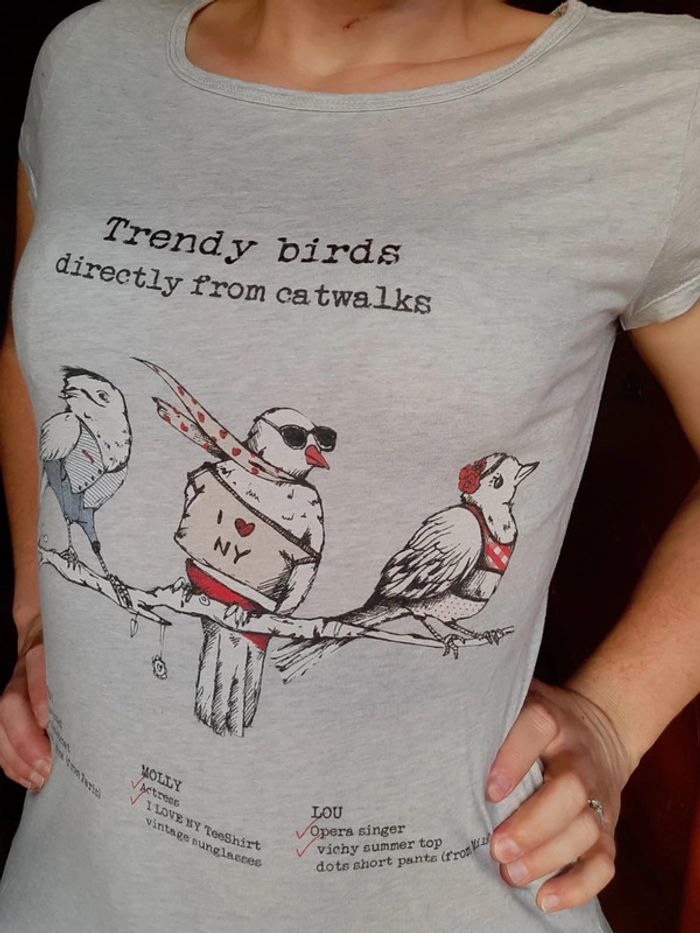 T-shirt camaïeu gris, motifs oiseaux, taille M