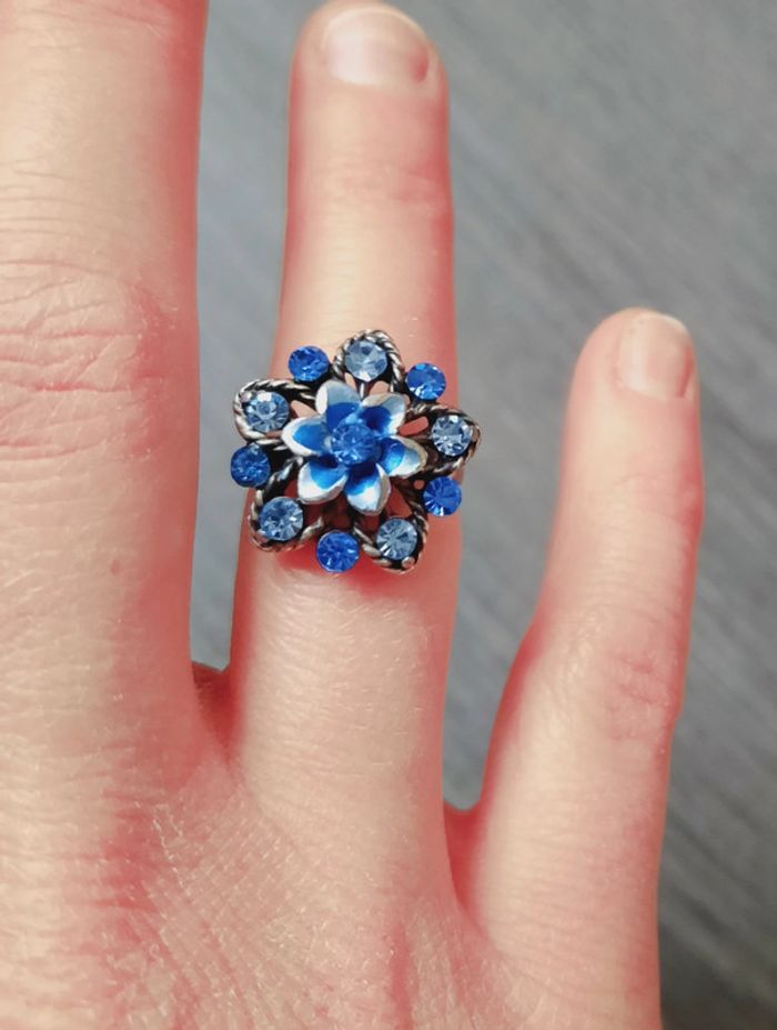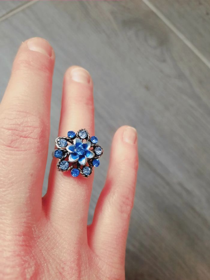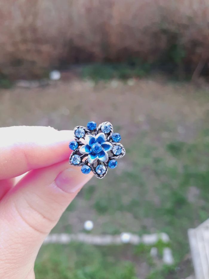 Bague fantaisie fleur bleue, strass, taille ajustable