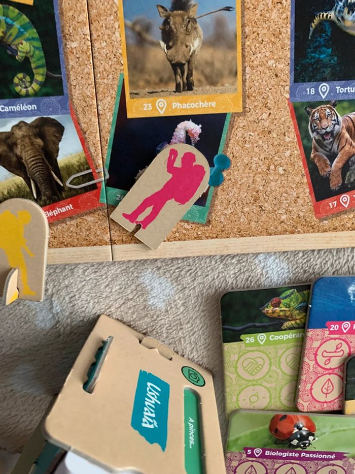 Utilisé plusieurs fois très bon état, manque un petit support d un pion, facilement remplaçable. Un jeu familial pour explorer le monde et ses richesses. Chaque joueur à son tour jette le dé et avance son explorateur du nombre de cases indiqué sur les  photos du plateau. Selon la couleur de la case d'arrivée il y a 4 types de défis à relever. Avec Notre monde ce sont des énigmes visuelles: il faut deviner une image qui apparaît par bandes. Pour Exploration il s'agit d'observer une photo pendant 30 secondes puis de répondre à une question. Les questions Surprenante planète, sur différents aspects de notre planète, ses habitants et sa protection proposent 2 réponses et il faut sélectionner la bonne. Il faut enfin indiquer si les propositions de Préserver la Terre, relatives à la protection de l’environnement, sont vraies ou fausses. Le premier joueur qui complète sa fiche de mission gagne la partie. Un jeu qui sensibilise à la protection de l’environnement et ou on apprend plein de choses sur la planète à travers 700 questions et défis! Contenu: 1 plateau de jeu (33,3 x 47 cm), 6 pions explorateur, 6 fiches de mission, 6 jetons vrai/faux, 1 dé en bois, 40 jetons d’exploration, 1 sac en tissu, 200 cartes (à plastifier pour un usage intensif en collectivité), 1 boitier pour les énigmes visuelles, règle. Jeu fabriqué avec 100% de matériaux recyclables. 25,80€