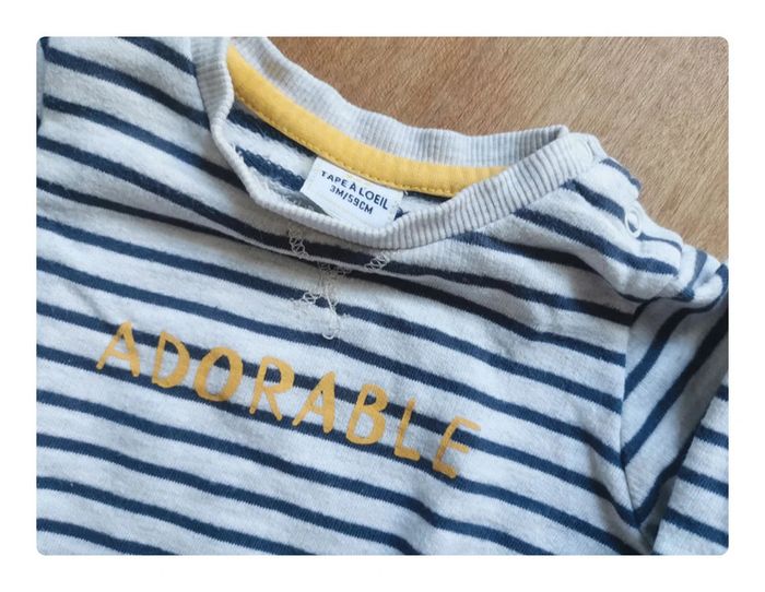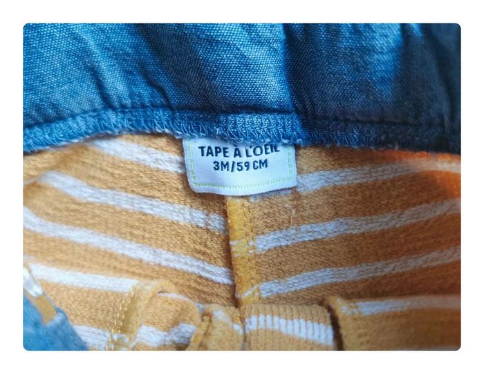 3 mois soit 59 cm Ensemble 3 pièces tape à l'œil ou Tao. Idéal pour l'été, la plage, les sorties au parc ou dans le jardin, composé: * d'un short bermuda en éponge Taille réglable + cordon devant Ouverture par bouton devant 2 poches devant Coloris orange et blanc rayé en maille relief Chambray aux poches et ceinture Revers à la base Étiquette "hello sommer au dos" Très bon état, peu porté Prix d'achat 12.99€ * d'un pull genre sweat gris rayé bleu gris, imprimé "adorable" en jaune moutarde devant Prix d'achat 19€ * d'un tee-shirt bleu marine et bord-côte aux manches et cou crème avec boutons pression à l'épaule gauche, imprimé citron fort, très bon état Prix d'achat 5.99€ 💰PARCE QU'IL N'Y A PAS DE PETITE ECONOMIE ! 🔥 Réduction sur lot active N’hésitez pas à composer votre lot 🛍 d'autres articles en taille 3mois 🔎 #simdelinetroismois ou directement avec le bouton ACHETER sous cette annonce ⬇️ 💸 articles à petits prix compatibles avec les remises 📦 colis envoyé en petit format Abonnez-vous afin d'avoir l'exclusivité sur les nouveautés 😊 #simdelinegarcon #simdelinetao #simedelinetapealoeil #ete #ensemble #ensembleete #ensemblebebe #tao3mois #tao #tapealoeilgarcon #simdelinelook #simdelinelot #ensemble3mois #lottapealoeil
