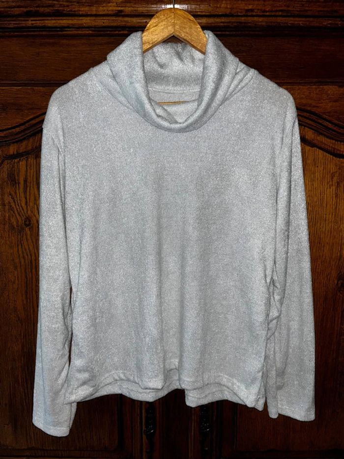 Très agréable à porté, à un col roulé assez gros. Gris à paillettes Porté 15 minutes une fois, en parfait état Taille 42/44