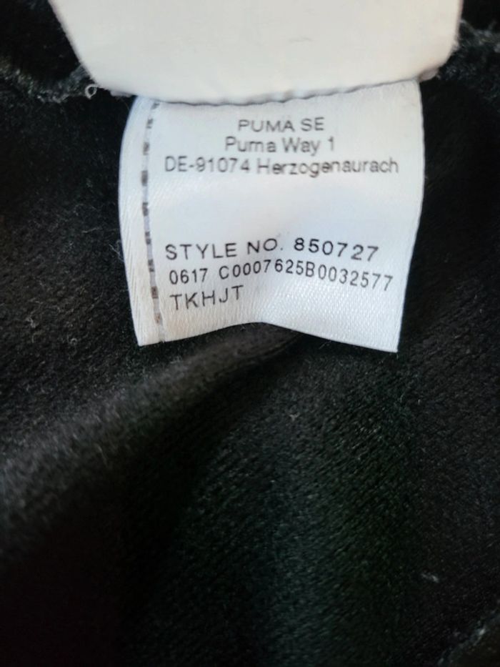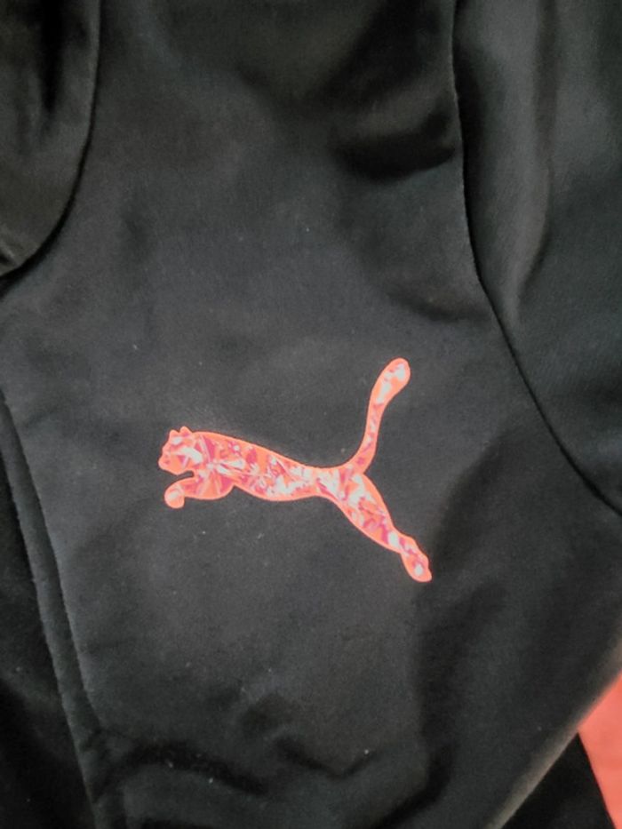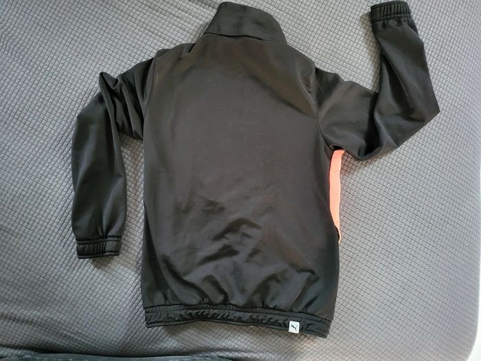 Veste de survêtement noire zippée Puma sans capuche "Bandes" roses fluo et logo rose fluo "marbré" 7/8 ans 128 cm Bon état Prénom barré derrière une des étiquettes internes (cf photo) Peinture écaillée sur la tirette de la fermeture éclair (cf photo)