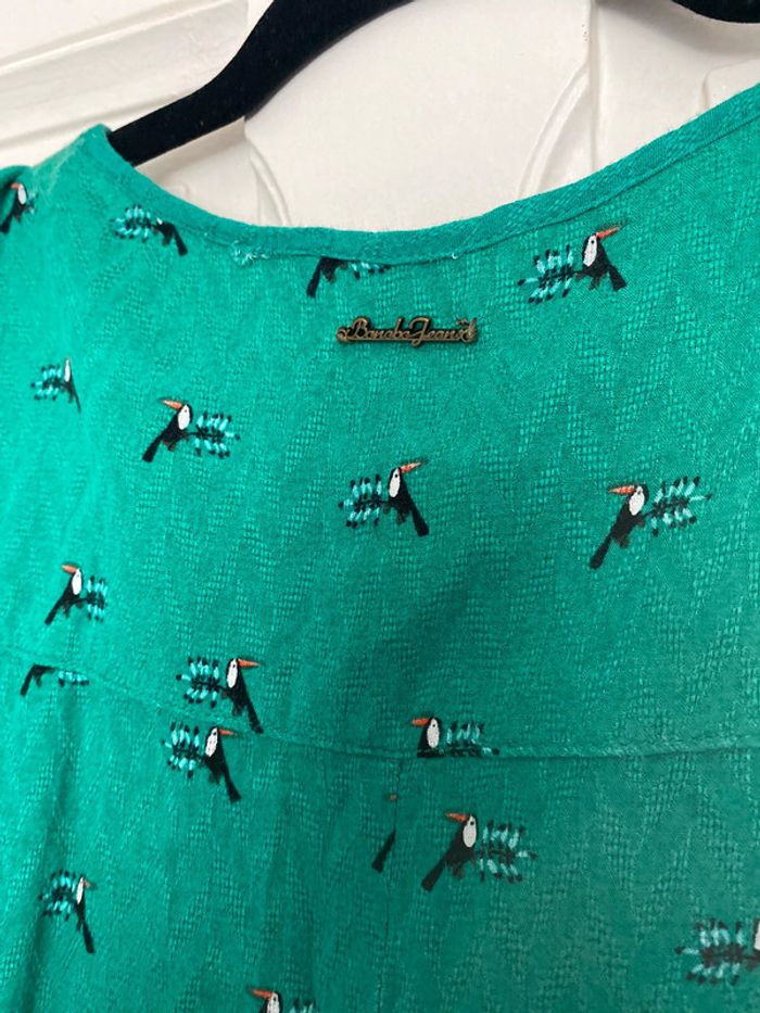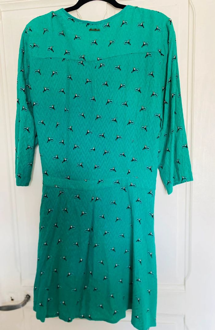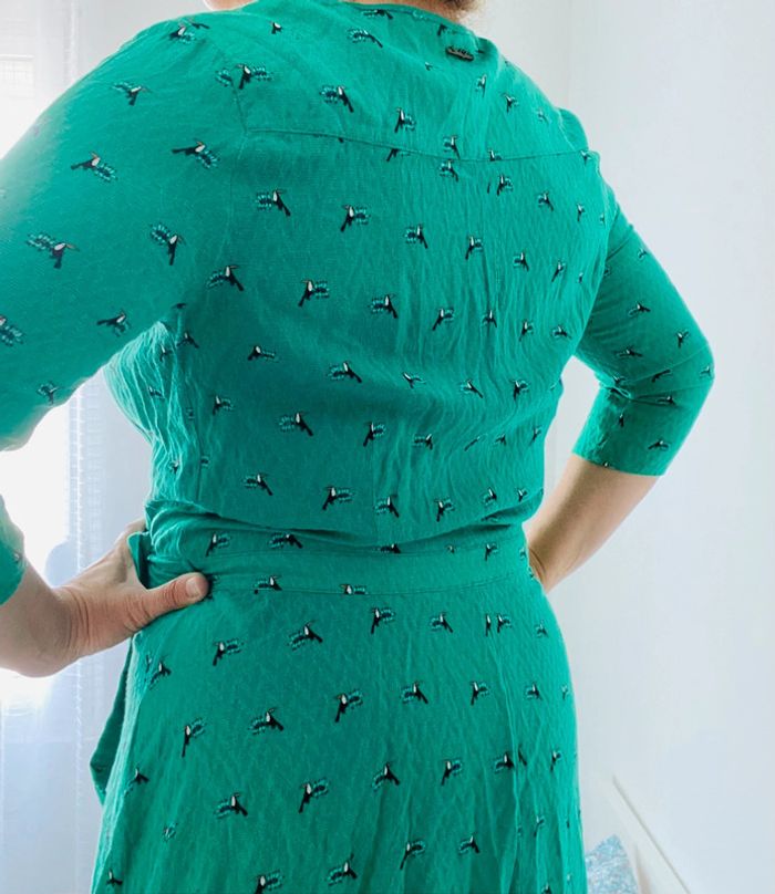 Jolie robe Bonobo Forme portefeuille Joli imprimé perroquet Très agréable à porter Manches longues Boutonnière intérieur taille et pression décolleté 100% viscose 96cm de longueur 43 épaule à épaule Très bon état