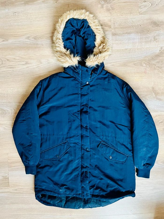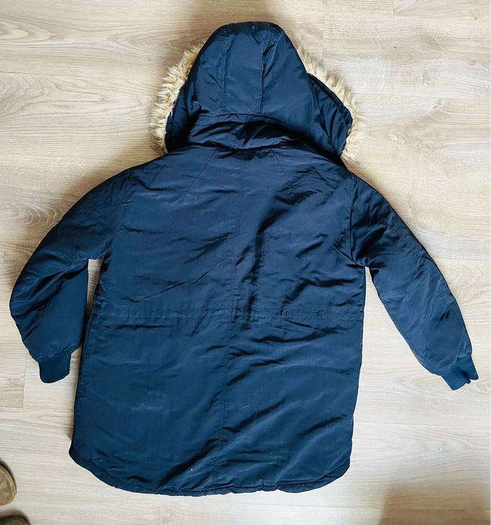 Très jolie doudoune bleu marine Moumoute capuche Fermeture éclair et bouton Très chaude Très bon état